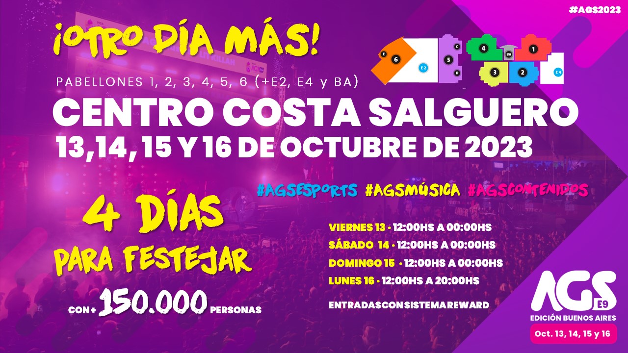 La novena edición de AGS, en la Ciudad de Buenos Aires, contará, como nos tiene acostumbrados, con innumerables sorpresas en cada una de sus jornadas durante los días 13, 14, 15 y 16 de octubre, en Costa Salguero. Si, esta vez AGS tiene #OtroDíaMás.
