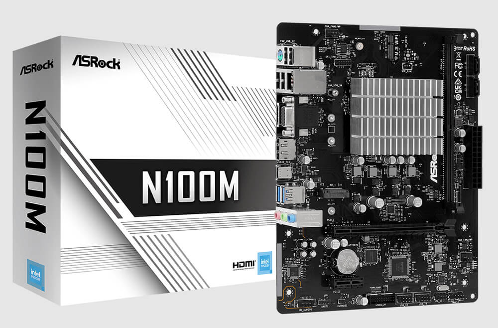 El ASRock N100M es un motherboard de formato Micro ATX diseñado para los usuarios que buscan una solución simple pero capaz. Posee conector USB tipo C y conectores M.2 tanto para SSDs como para WiFi. En su panel principal cuenta con salidas de video HDMI 2.1, DisplayPort 1.4 y D-Sub. El N100M también se destaca por incluir un slot de expansión PCIe 3.0 x16 (modo x2) y un PCIe 3.0 x1.