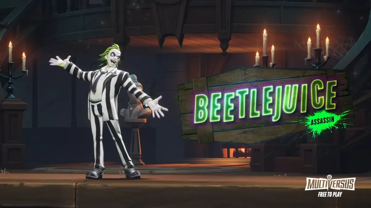 Beetlejuice, el “Bio Exorcista”, llega al juego como un peleador de clase asesino con habilidades únicas que incluyen invocar escarabajos y gusanos de arena, expulsar picos para infligir daño, y lanzar devastadores martillos aéreos. El tráiler también presenta la variante Matador Beetlejuice y varias variantes inspiradas en la película de Beetlejuice, disponibles para una serie de personajes en MultiVersus.