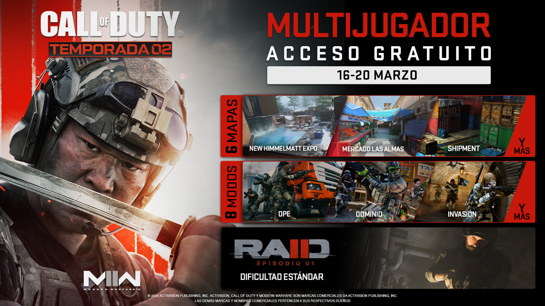 Del 16 al 20 de marzo, los jugadores del acceso gratuito podrán pelear en seis mapas multijugador y en una gran variedad de modos de juego junto con el primer Raid cooperativo. Inviten a tus amigos y familiares a competir, tanto si han sido sus compañeros de escuadrón en Call of Duty: Warzone 2.0 o si es la primera vez que participan.