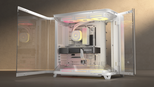 El chasis también incorpora conductos de flujo de aire duales en la cámara principal, con ventiladores de rotor inverso preinstalados que canalizan el aire directamente hacia la GPU, ubicada en su propia cámara con hasta 430 mm de espacio disponible. El diseño está pensado para maximizar el rendimiento sin sacrificar la estética, con paneles de vidrio templado envolventes que se abren mediante bisagras ocultas para un acceso fácil y una vista panorámica del hardware.