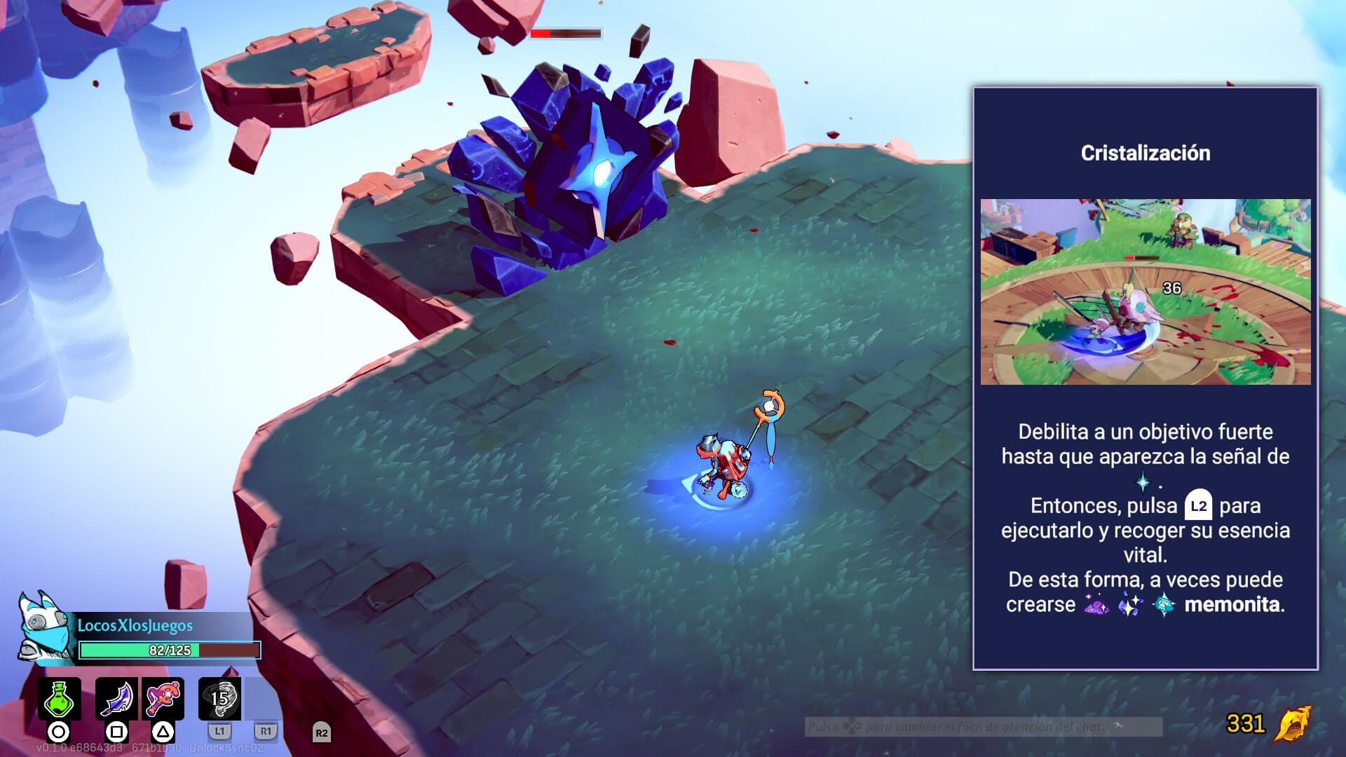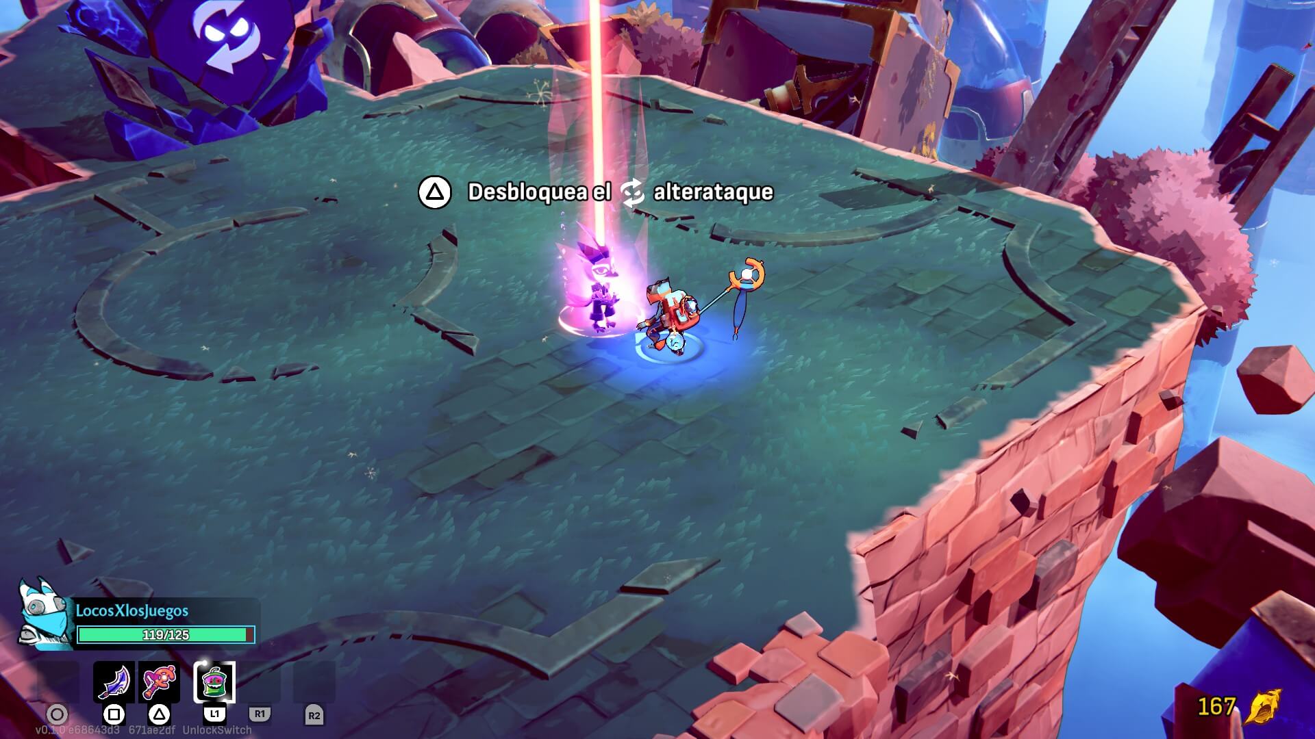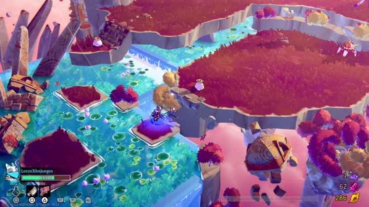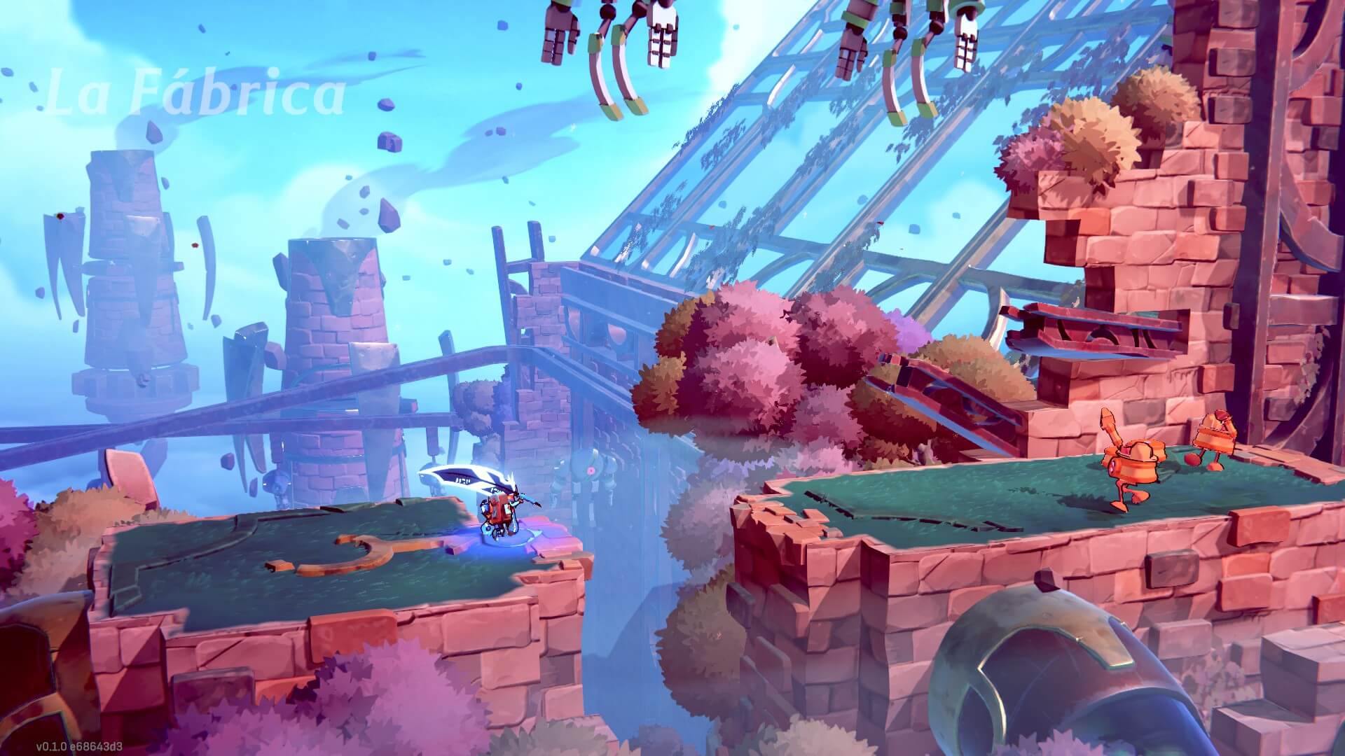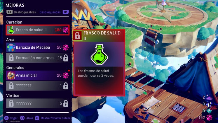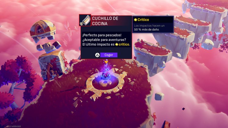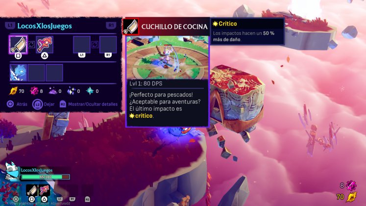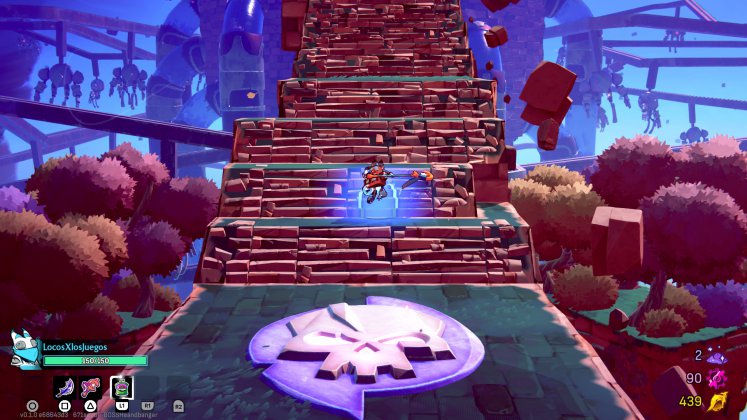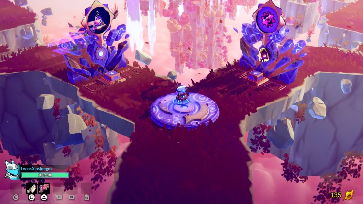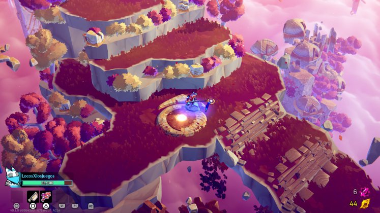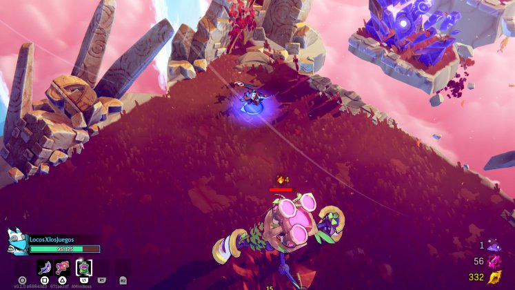 Otra mecánica esencial es el sistema de propulsión del personaje, que permite esquivar ataques y moverse con agilidad entre las islas flotantes. Este “dash” es un recurso ilimitado que se vuelve crucial para sobrevivir en el caos de la batalla, permitiendo esquivar ataques y abrir oportunidades para atacar a los enemigos. Su buen uso puede ser determinante, convirtiéndolo en una herramienta imprescindible.