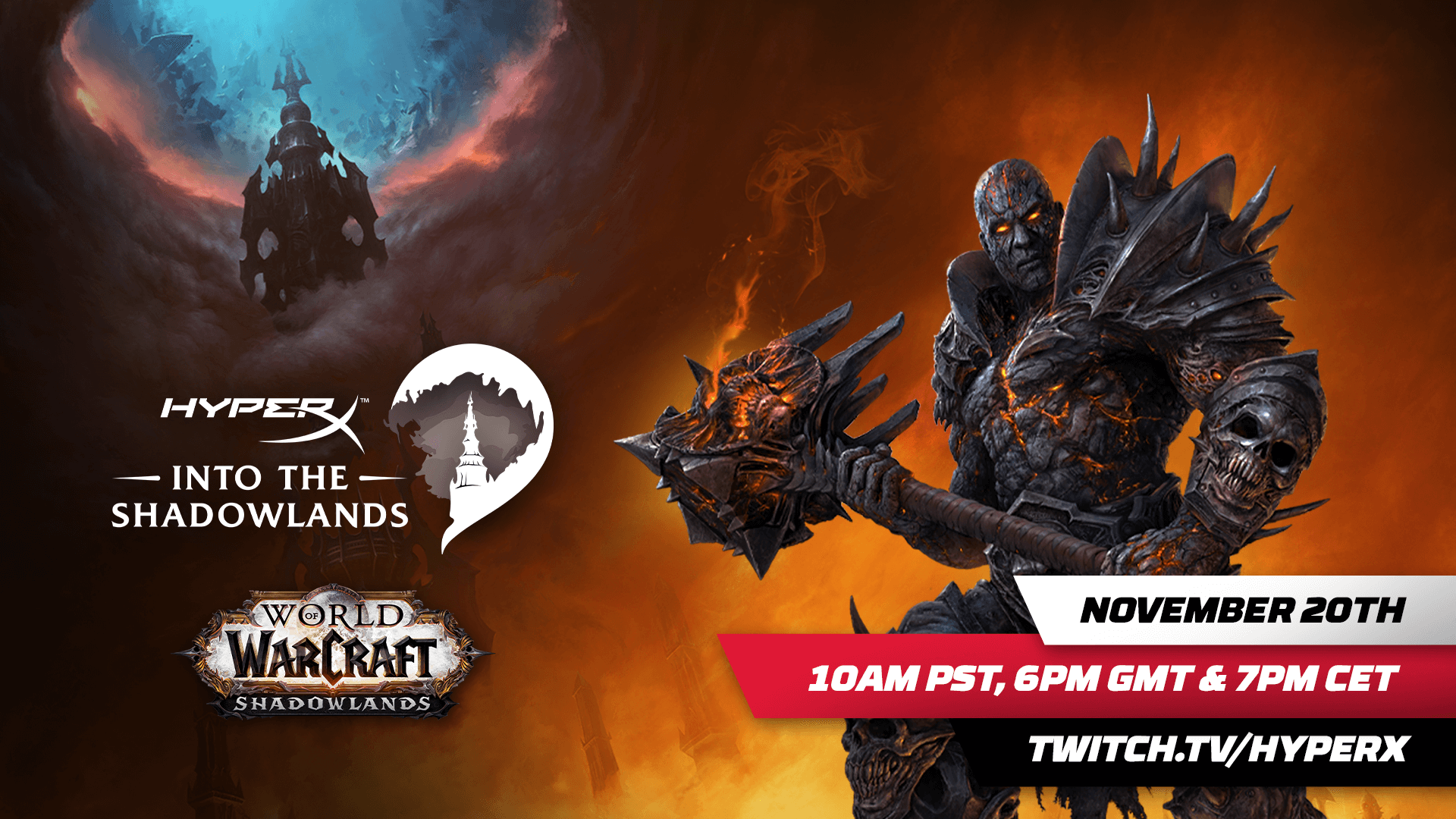 HyperX, la división de juegos de Kingston Technology Company, Inc., se ha unido a Blizzard Entertainment para un evento de transmisión en vivo que celebra el lanzamiento de World of Warcraft: Shadowlands, la nueva expansión de Blizzard por su aclamado juego de rol multijugador masivo en línea. Los fanáticos de WoW pueden unirse al evento In to the Shadowlands a través del canal de Twitch de HyperX el 20 de noviembre de 2020 a las 10 a.m. PST, 6 p.m. GMT o 7 p.m. CET para horas de entretenimiento previas al lanzamiento de la expansión el 23 de noviembre.