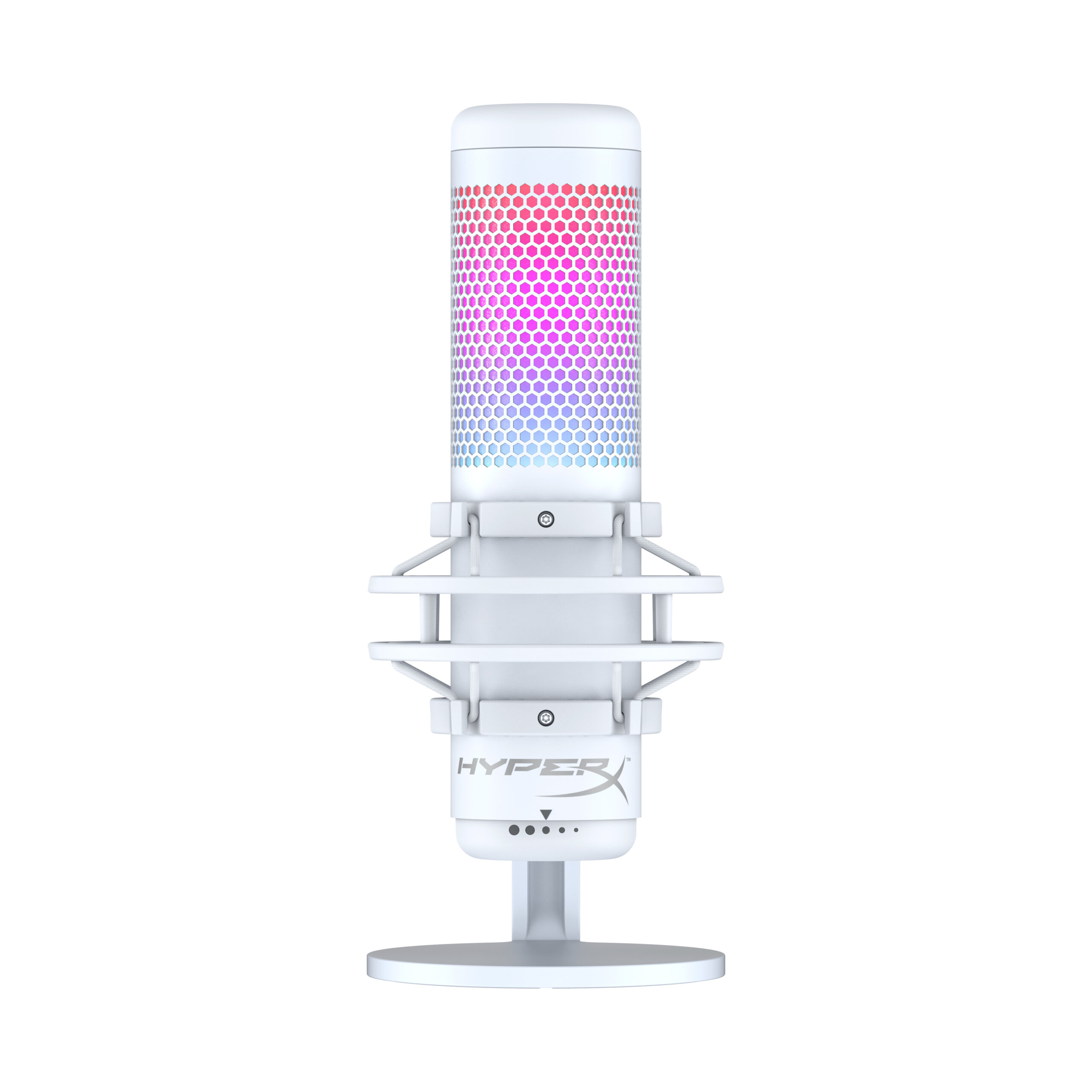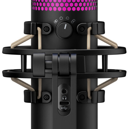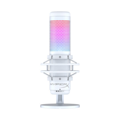 Por su parte, el Quadcast White, también RGB, tiene condensador USB con un diseño y sonido espectaculares. Lo mismo que su iluminación RGB con efectos dinámicos que añaden un toque de estilo y elegancia en cualquier stream o setup. Además, pueden personalizarse mediante el software HyperX NGENUITY. Es un micrófono que cuenta con todo, suspensión elástica antivibración para filtrar los ruidos cotidianos y filtro antipop que amortigua los molestos sonidos plosivos. Aísla el micrófono y suprime el sonido de estruendos y golpes no intencionados. Conoce al instante el estado del micrófono gracias al sensor de silenciamiento con un toque en el indicador LED, evita problemas de retransmisión inesperados. Cuenta con cuatro patrones polares (estéreo, omnidireccional, cardioide, bidireccional) para optimizar la configuración de emisión y mantener la atención en los sonidos que desea que se escuchen. Asimismo, tiene un dial de control de ajuste de ganancia para regular rápidamente la sensibilidad de entrada. El adaptador de montaje incluido es compatible con los tamaños de rosca de 3/8” y de 5/8”, lo que permite utilizar la mayoría de soportes. Cuenta con certificación Discord y TeamSpeak, por lo que tendrás la certeza de que tus seguidores y oyentes te escucharán alto y claro. Además, puedes supervisar el micrófono en tiempo real mediante el práctico conector de auriculares ubicado en la parte posterior del mismo. Es compatible con múltiples plataformas, por lo que puedes ofrecer calidad de sonido tanto si lo conectas en un PC, PS5, PS4 o Mac. Se puede obtener en Integrados Argentinos.