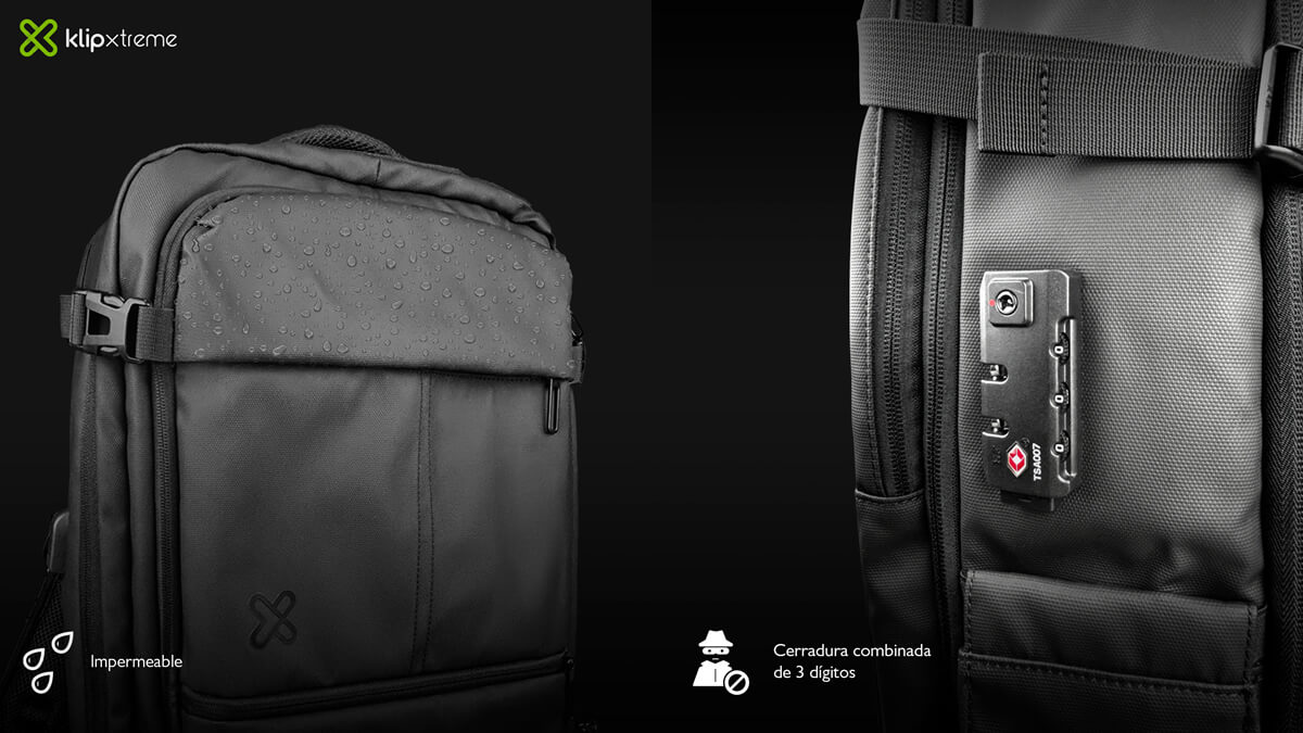 El diseño incluye tres compartimentos principales con cierre, uno de ellos expandible para viajes cortos, y un bolsillo especializado para notebooks de hasta 17 pulgadas. También incorpora bolsillos funcionales y un sistema antirrobo con cerradura de combinación de tres dígitos, clave para proteger objetos de valor.