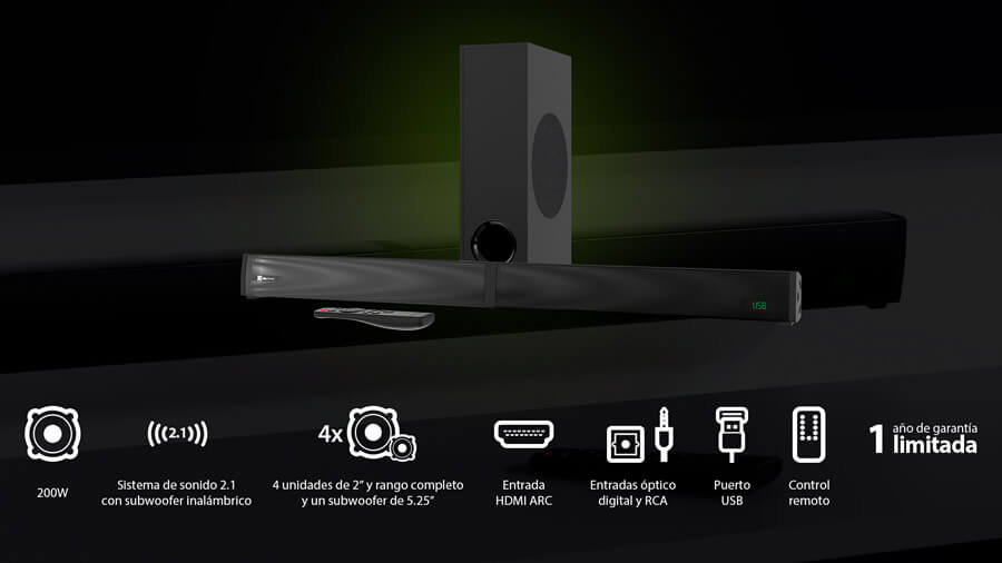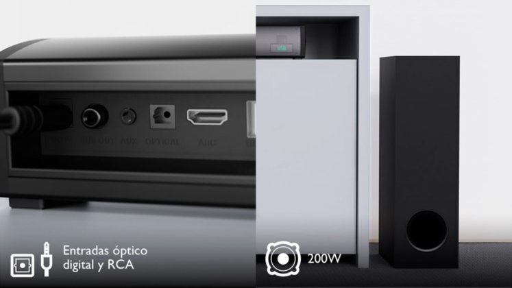 El diseño moderno y elegante de la barra, sumado a una pantalla LED que indica el modo seleccionado y un control remoto con funciones de ecualización para música, cine, noticias o juegos, permite personalizar la experiencia de sonido según cada preferencia. Se puede colocar sobre una superficie o montar en la pared, adaptándose a cualquier espacio.