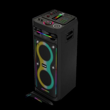 Uno de sus diferenciales es la batería de litio incorporada (22.2V, 6000 mAh), que permite autonomía extendida, ideal para su uso en exteriores o en espacios sin conexión eléctrica. Además, incorpora efectos de iluminación LED dinámicos para sumar impacto visual a la experiencia sonora.