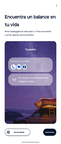 Basándose en estos datos, Motorola presenta una nueva experiencia de software llamada Moto Unplugged para ayudar a los consumidores a descansar de las distracciones de sus teléfonos. Moto Unplugged permite a las personas dar un paso atrás y adaptar su experiencia móvil a su modo de pensar, permitiéndoles elegir cuándo y cómo quieren desconectar.