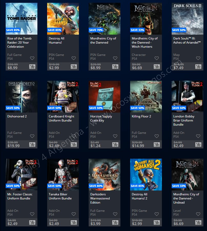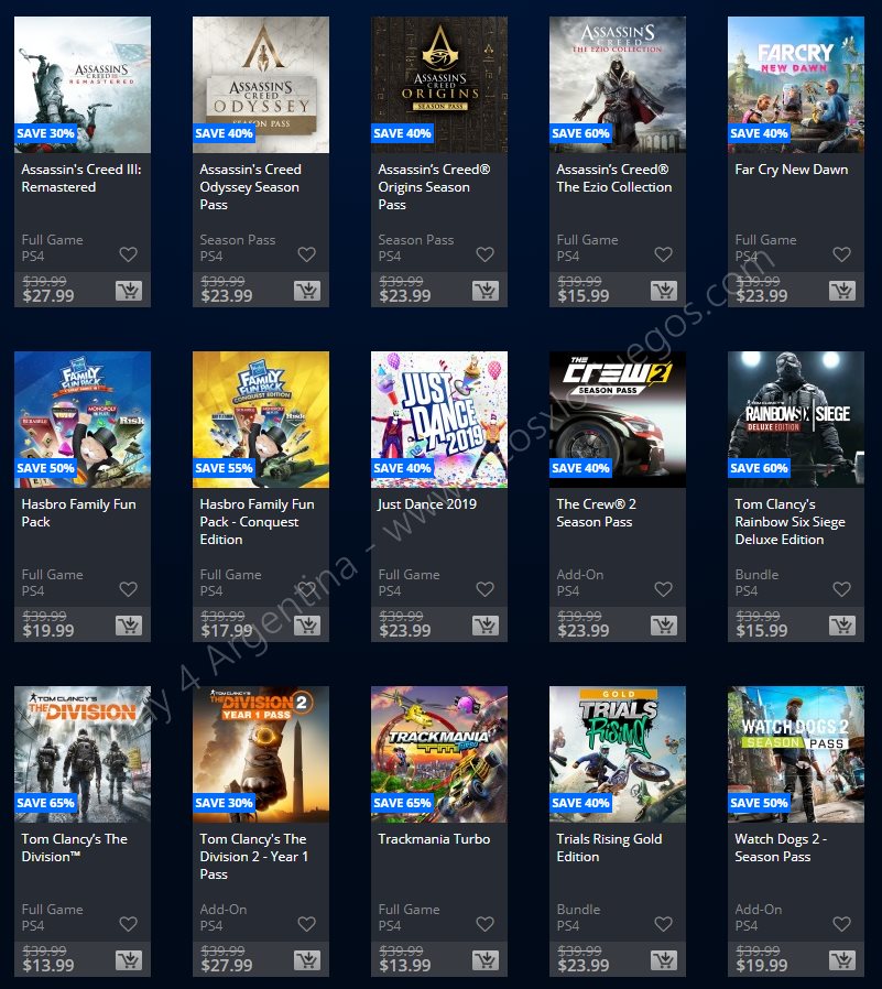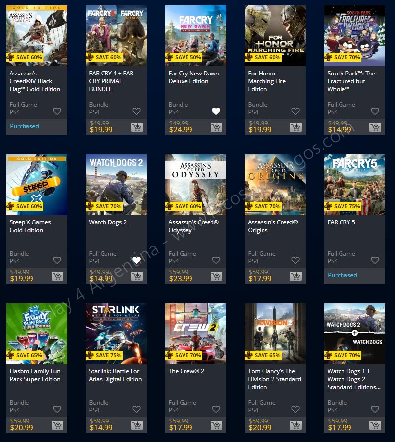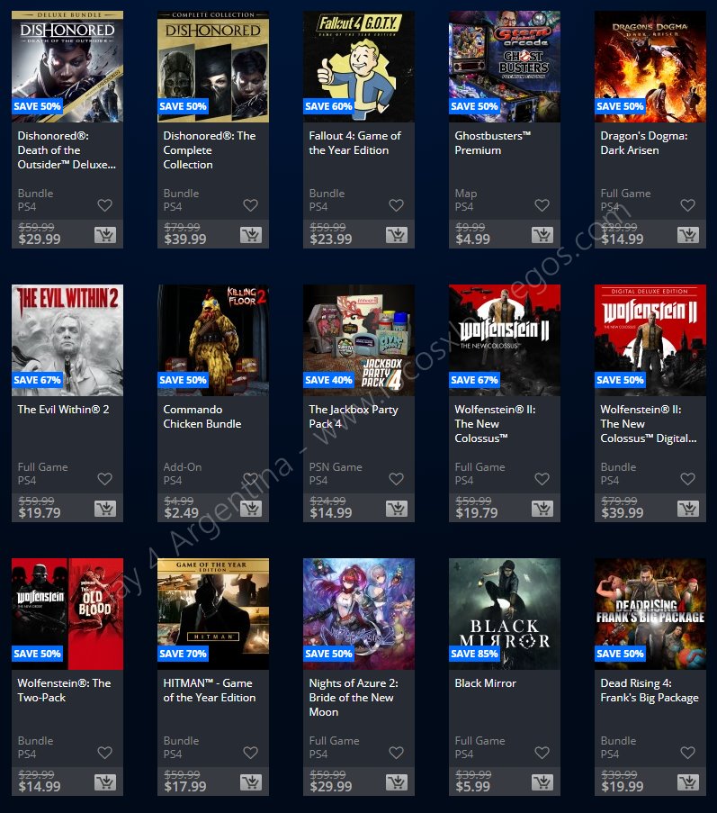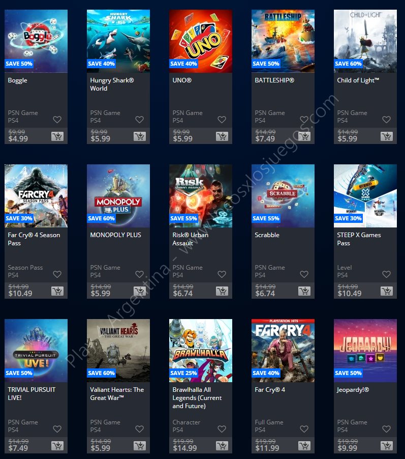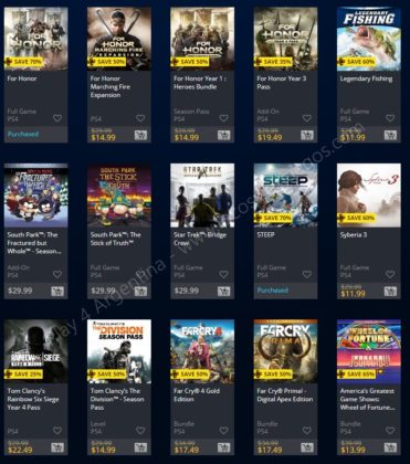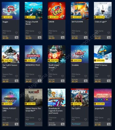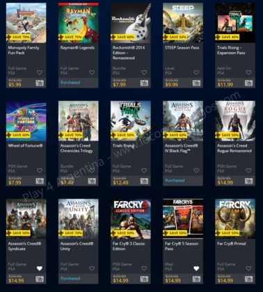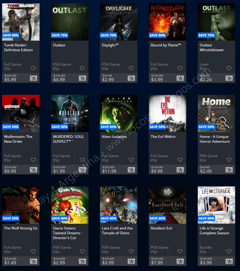 Recuerden que dichos juegos estarán en precio promocional para PlayStation 4, PlayStation 3 y PS Vita: Halloween Sale (Hasta el 1/11), Ubisoft Sale (Hasta el 29/10), y EA Sale (Hasta el 22/10) (revisar bien cual juego nos interesa). Como siempre, si quieren ver las ofertas antes que nadie, no duden en sumarse al grupo de Play 4 Argentina en facebook. (Link).