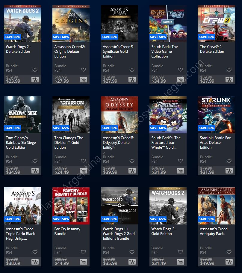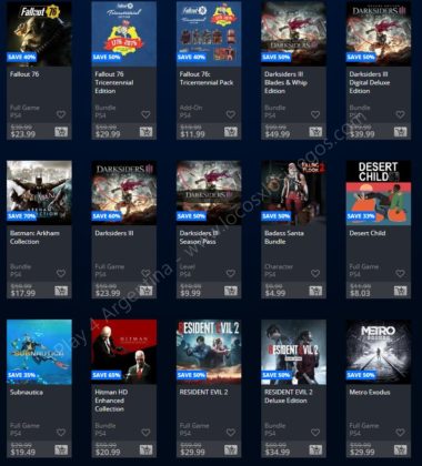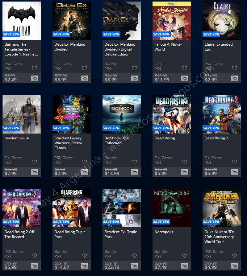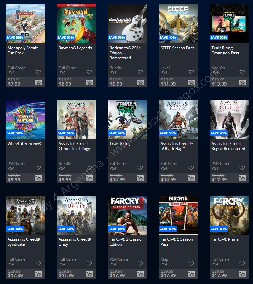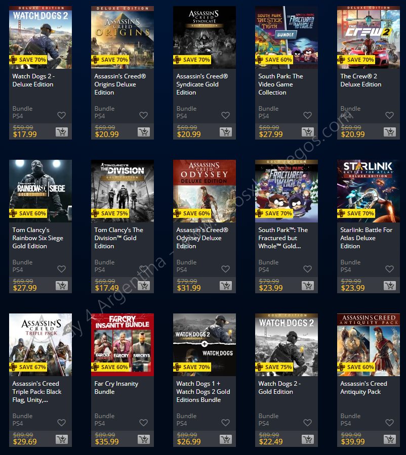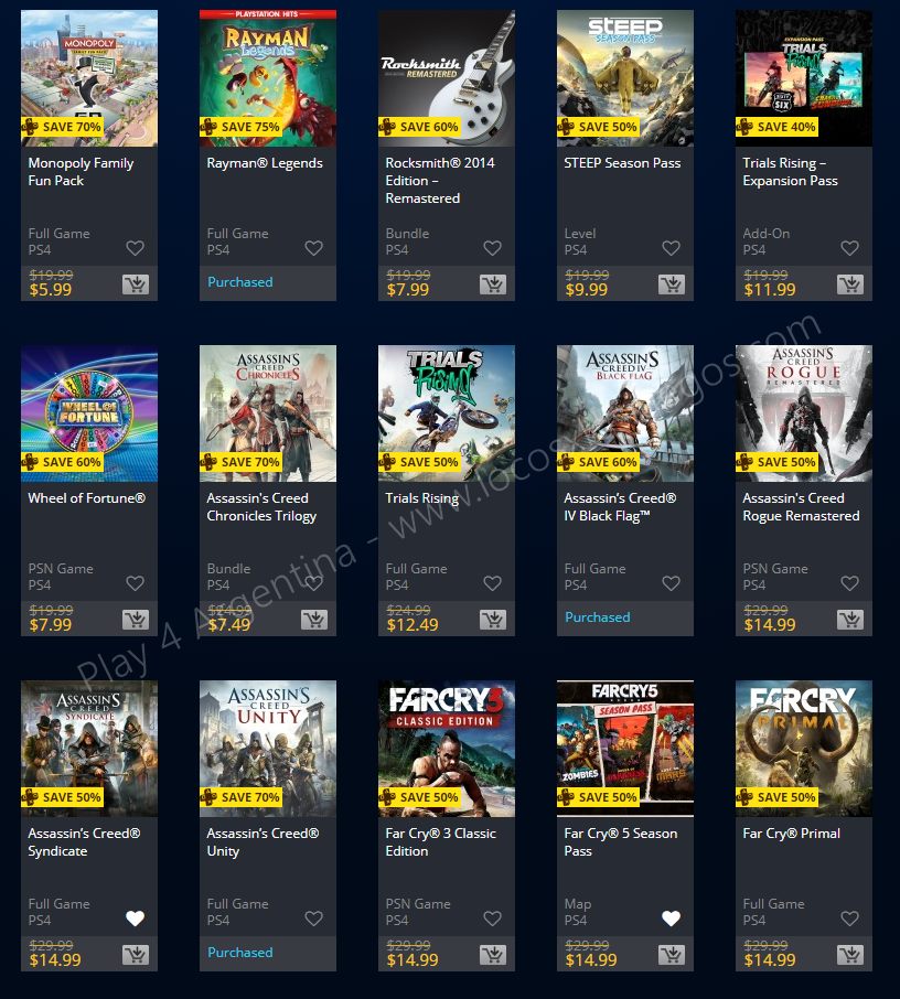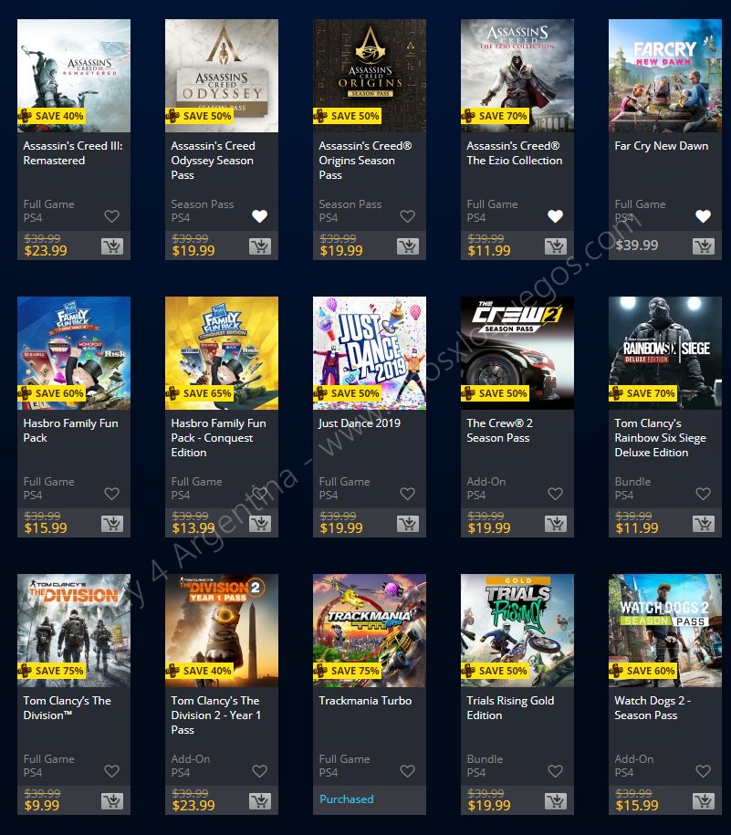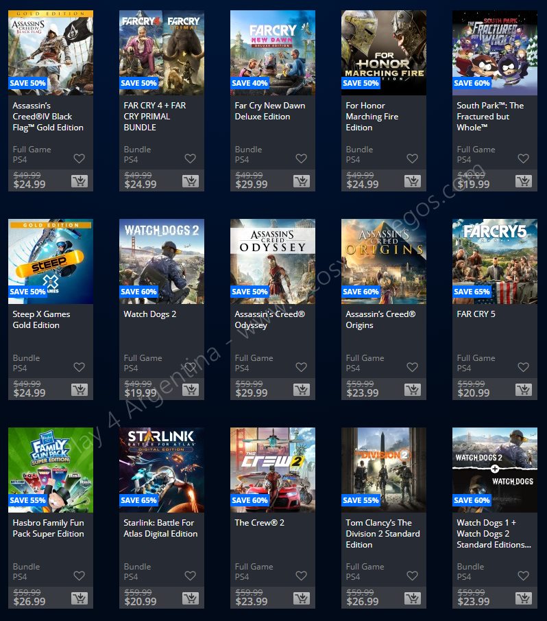 Recuerden que dichos juegos estarán en precio promocional para PlayStation 4, PlayStation 3 y PS Vita: Halloween Sale (Hasta el 1/11), Ubisoft Sale (Hasta el 29/10), y EA Sale (Hasta el 22/10) (revisar bien cual juego nos interesa). Como siempre, si quieren ver las ofertas antes que nadie, no duden en sumarse al grupo de Play 4 Argentina en facebook. (Link).