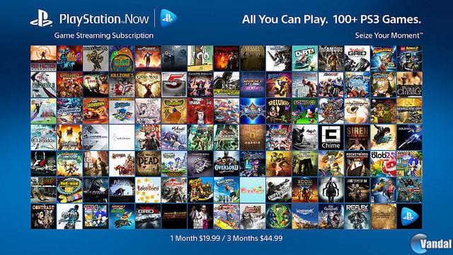 El catálogo inicial será de más de 100 juegos de PlayStation 3 de diversos géneros sin necesidad de instalación ni descarga. Hay dos programas de suscripción: un mes por 19,99 dólares y tres meses por 44,99 dólares -unos 15 dólares por mes- que dan acceso a todos estos títulos.