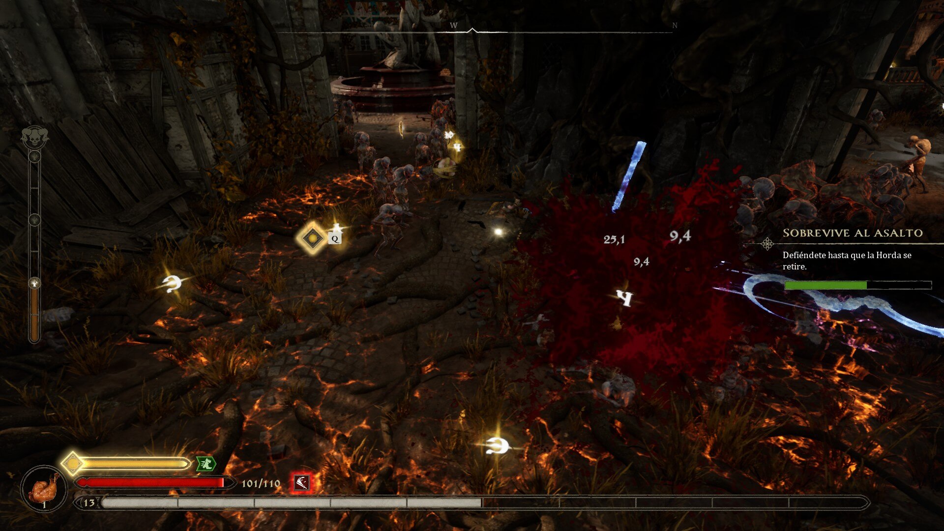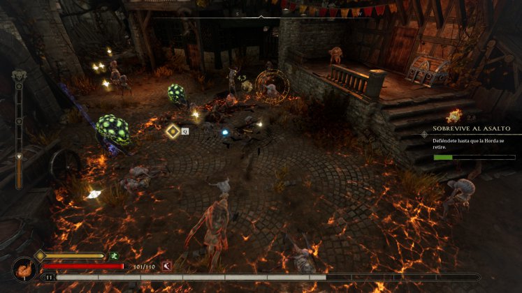 Cada escenario funciona como una arena donde hay que derrotar una cantidad de enemigos antes de poder avanzar, a pesar de que solo pudimos probar uno en esta demo. Al ingresar al nivel tendremos una misión principal que podría ser eliminar a N cantidad de enemigos, y al completarla debemos ir a buscar otra, totalizando 4 misiones que desbloquean la batalla contra el jefe del nivel. En sintonía con la primer misión, el resto que obtenemos no se alejan de la idea de eliminar enemigos especiales, o hacer algún acción particular como defender a un aldeano. Hasta el momento, el ingenio no está aplicado completamente aquí.