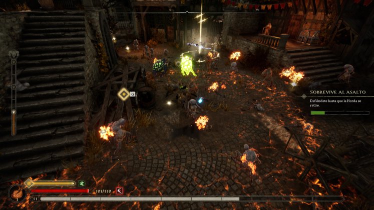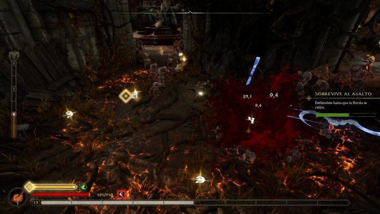 El combate es rápido y bastante flexible. Si bien solo podremos hacer un ataque rápido, uno más fuerte, esquivar y bloquear, ante la incesante cantidad de enemigos que puede haber, por más que dominemos esos 4 botones va a ser complicado llegar a la victoria. Ojo, para ser alguien que con frecuencia juega este género, no me pareció un desafío tan grande a estas alturas, quizás porque entiende que las mejores habilidades para adquirir al incrementar el nivel son aquellas de área de efecto (AoE).