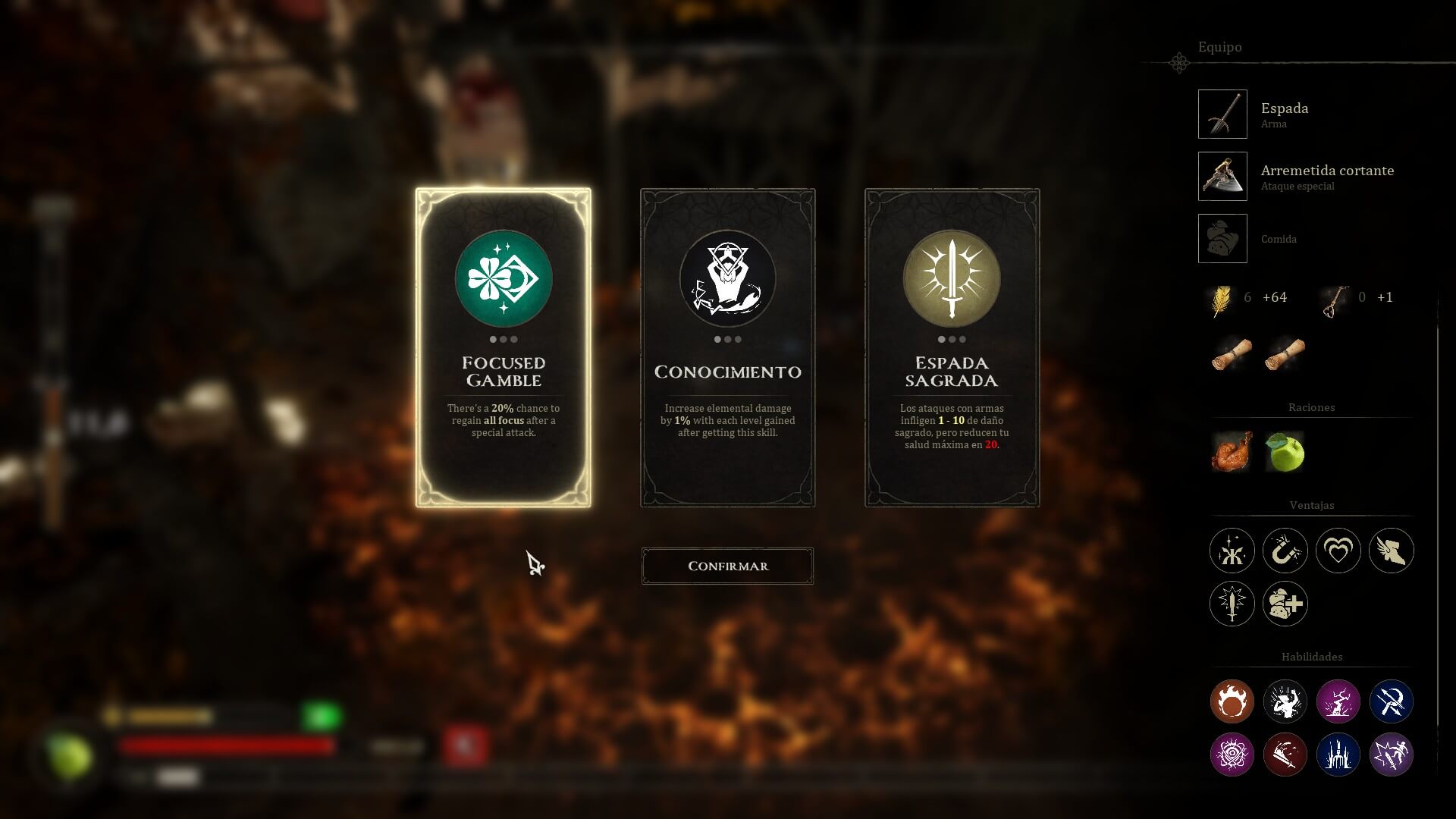Como mencioné anteriormente, a medida que se derrota enemigos, se sube de nivel y se pueden elegir mejoras entre tres opciones aleatorias. Algunas son más útiles que otras, dependiendo del estilo de juego que usemos. En general, cada habilidad que se obtiene puede volver a aparecer posteriormente, lo que haría que aumente su poder hasta 3 veces. Algunas habilidades (y las que más recomiendo usar) van desde un rayo que impacta cada ciertos segundos a un enemigo en un rango, un láser que dispara, el agregado de fuego a nuestros ataques o la aparición de un boomerang destructor con cada ataque. En mi estrategia, siempre las mejores habilidades son a distancia, las que permiten hacer el llamado “crowd control” o “control de masas”, dado que principalmente a eso nos enfrentamos: muchísimos enemigos, pero de baja resistencia.