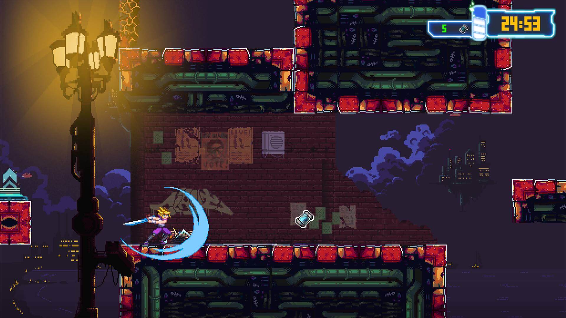 Por último, dos detalles no menores. Por un lado, el apartado visual lo pueden apreciar en nuestro video y las imágenes aquí publicadas, y notaran un 2D pixel-art muy atractivo con tintes cyberpunk que mezcla tonalidades que reflejan perfectamente el ambiente. Por otro, el juego posee un multijugador local y posteriormente se habilitará el online para poder competir con otros jugadores alrededor del mundo, una excelente idea si son fanáticos de la competencia sana.