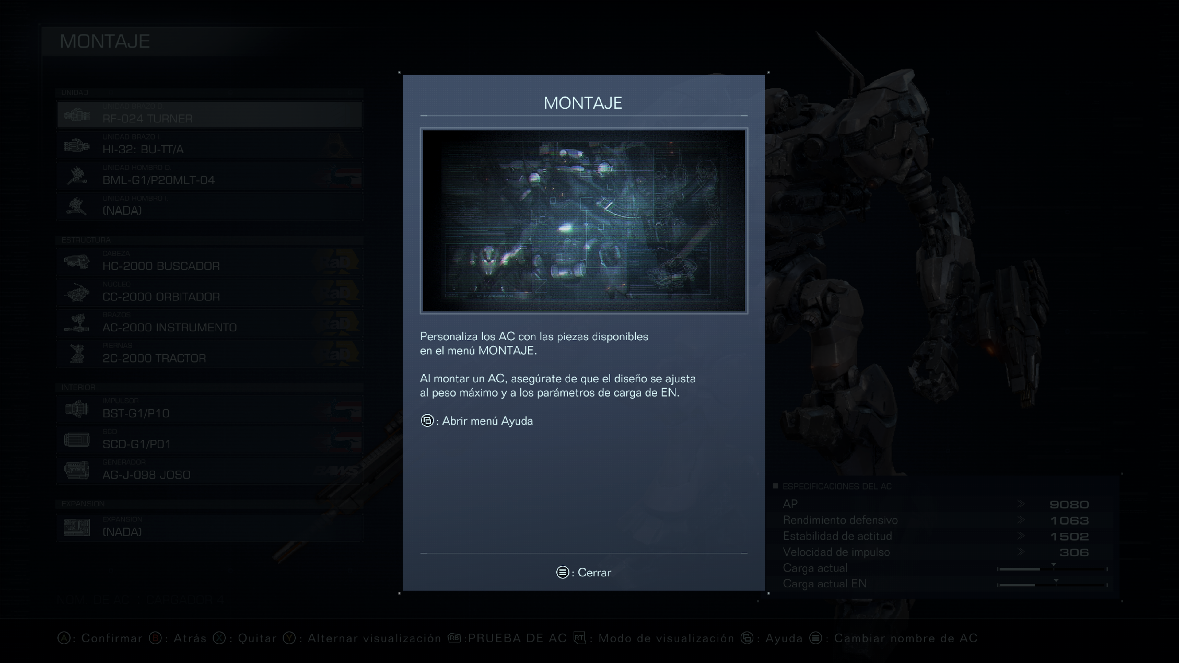 No se trata de comprar la pieza más potente y cara que veamos, sino de encontrar las que se ajusten a lo que queremos y asegurarnos de que el conjunto de todas ellas dé como resultado una máquina eficaz y capaz de cumplir la misión a la que vamos a enfrentarnos. Todas las piezas tienen sus pros y contras que van a limitar lo qué podemos equiparnos y hacer si no queremos acabar con sobrecarga o con un rendimiento bajo (como ser lento a la hora de movernos o poca barra de propulsión). Vamos a poder incrementar ciertas estadísticas al elegir piernas o el módulo correcto, pero vamos a sacrificar otras cosas que van a ir descubriendo a medida que avancen en el juego.