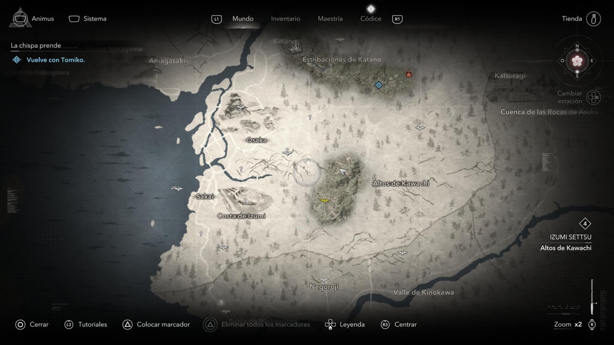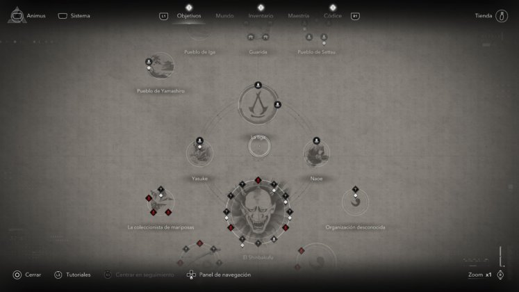 Todo el equipamiento, armas, armaduras, objetos, y mapas, lo encontraremos diseminado por una hermosa representación de Japón durante el Siglo XVI. En las ciudades, estarán dentro de fortalezas o en pequeños asentamientos cuidados por pocos enemigos, pero siempre podremos verlo con nuestra vista de águila. Los puntos dorados serán cofres que podremos saquear, mientras que los azules serán objetos o personas con los que tendremos que interactuar durante una misión.