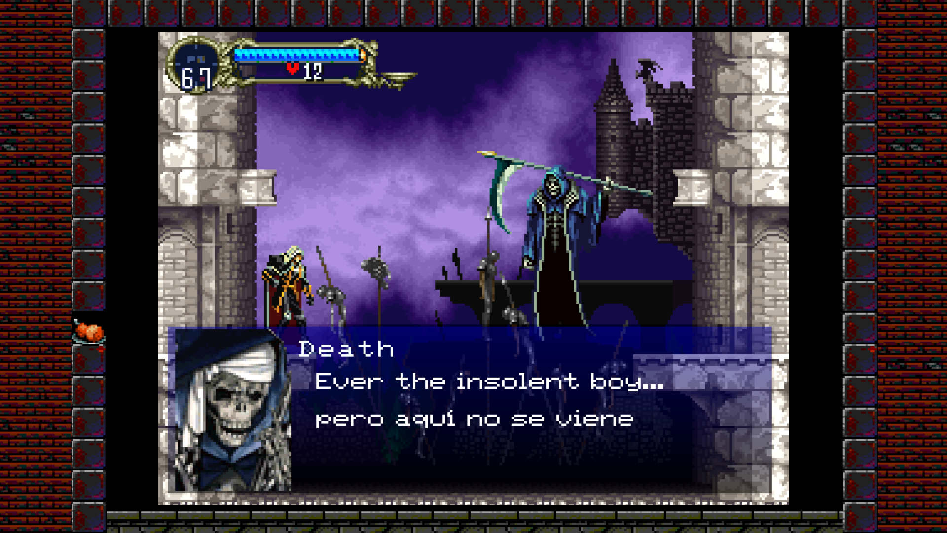 ¿Qué novedades incluye esta nueva versión de Castlevania Requiem? Poco: se aumento la resolución a 1920×1080 o 4K (PS4 Pro), También se puede seleccionar el tamaño de la pantalla (normal o completa, pero siempre manteniendo la relación de aspecto) y seis marcos distintos, aunque esto también estaba en The Dracula X Chronicles. Contamos con vibración y efectos de sonido que se reproducen a través del altavoz, como los que se escuchan al recoger corazones. La novedad también esta en que no se tomaron el trabajo en arreglar los errores de traducción y mejorar la presentación, son gráficamente muy pobres.