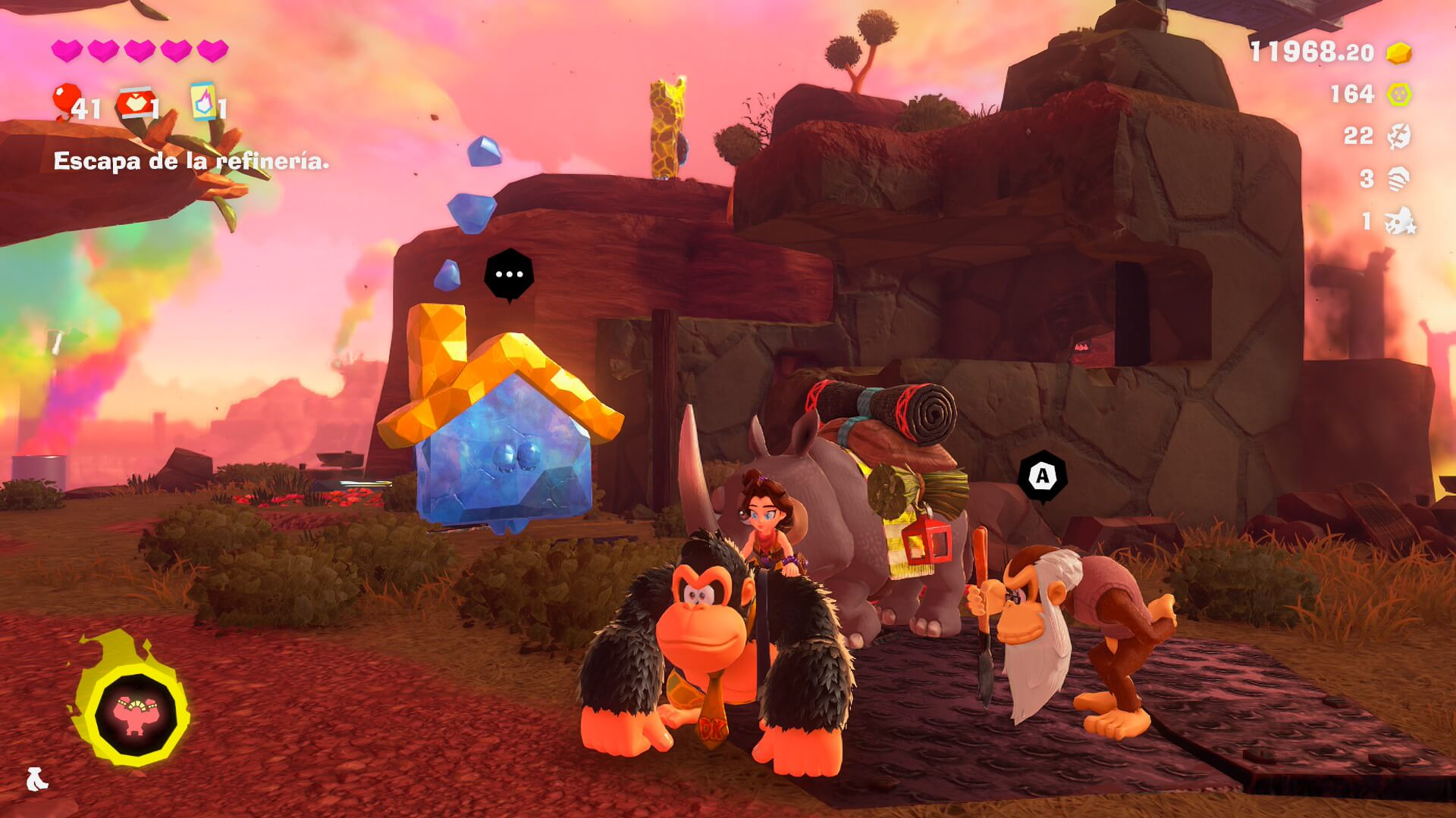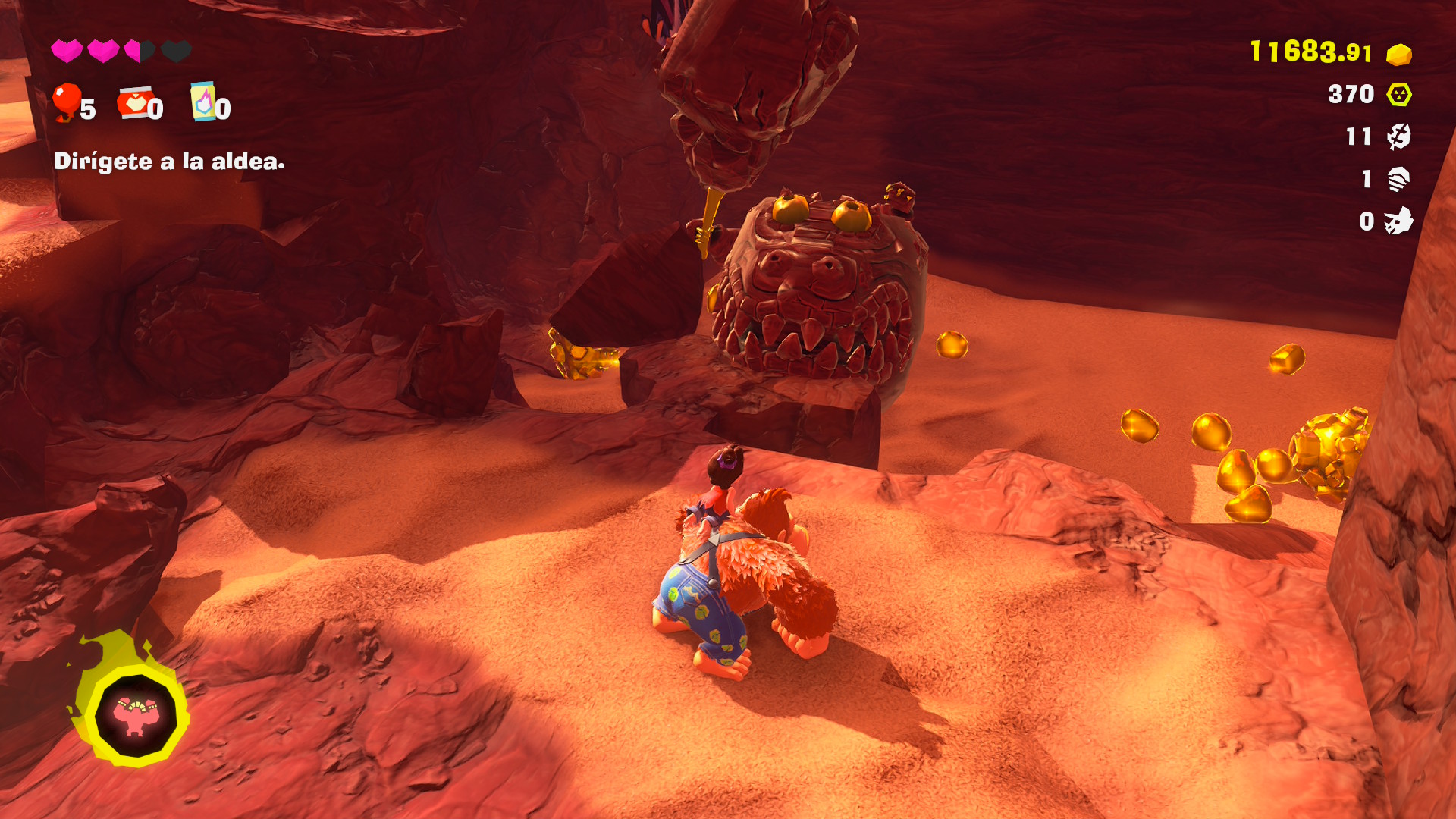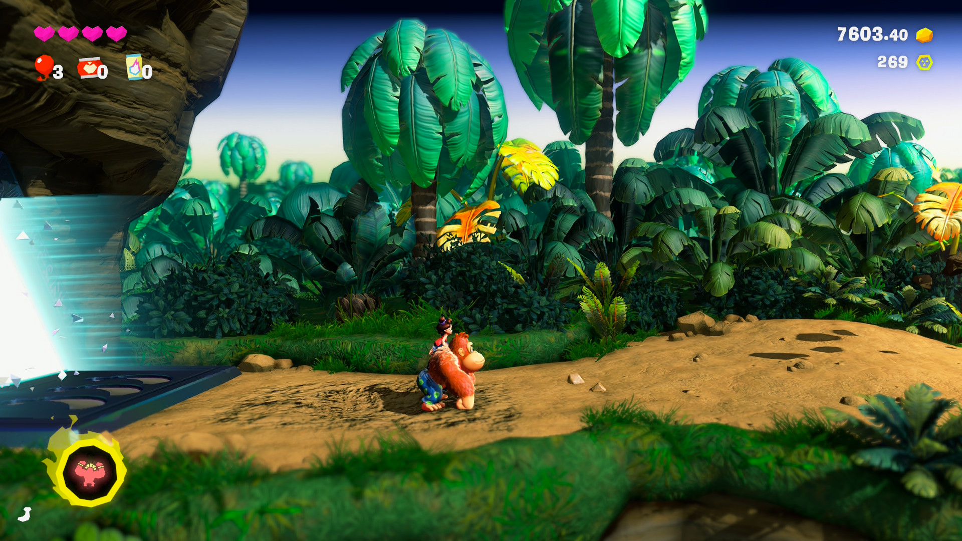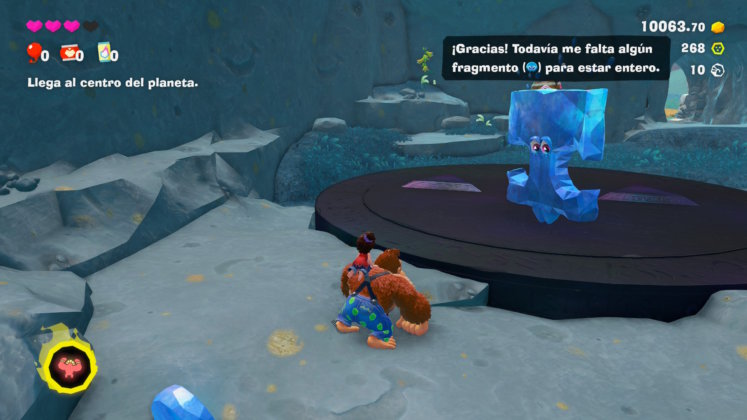 Pero esto nos servirá no sólo para aumentar el porcentaje de material destruído en cada nivel, sino que nos permitirá descubrir diversos ítems que ayudarán a Donkey Kong y Pauline en su aventura. Así, las Gemas de Banandio nos permitirán obtener un punto de habilidad por cada 5 plátanos ingeridos; los fósiles y monedas especiales servirán para adquirir distintos accesorios con beneficios especiales para ambos personajes; y con el oro que juntemos podremos adquirir mapas con ubicaciones de Gemas y fósiles en cada uno de los estratos que visitemos, entre otras cosas. ¿Cómo hacemos para descubrir las ubicaciones de las Gemas y los fósiles se preguntarán? Bueno, nuestro mono favorito puede golpear el suelo con sus palmas resultando en una especie de sonar que nos mostrará la ubicación, siempre en un radio cercano, de cada uno de estos ítems. La gran mayoría del tiempo estaremos rompiendo rocas y golpeando el suelo para descubrir todo, y nos sorprenderá la cantidad de veces que dejaremos la historia de lado solamente para seguir demoliendo.