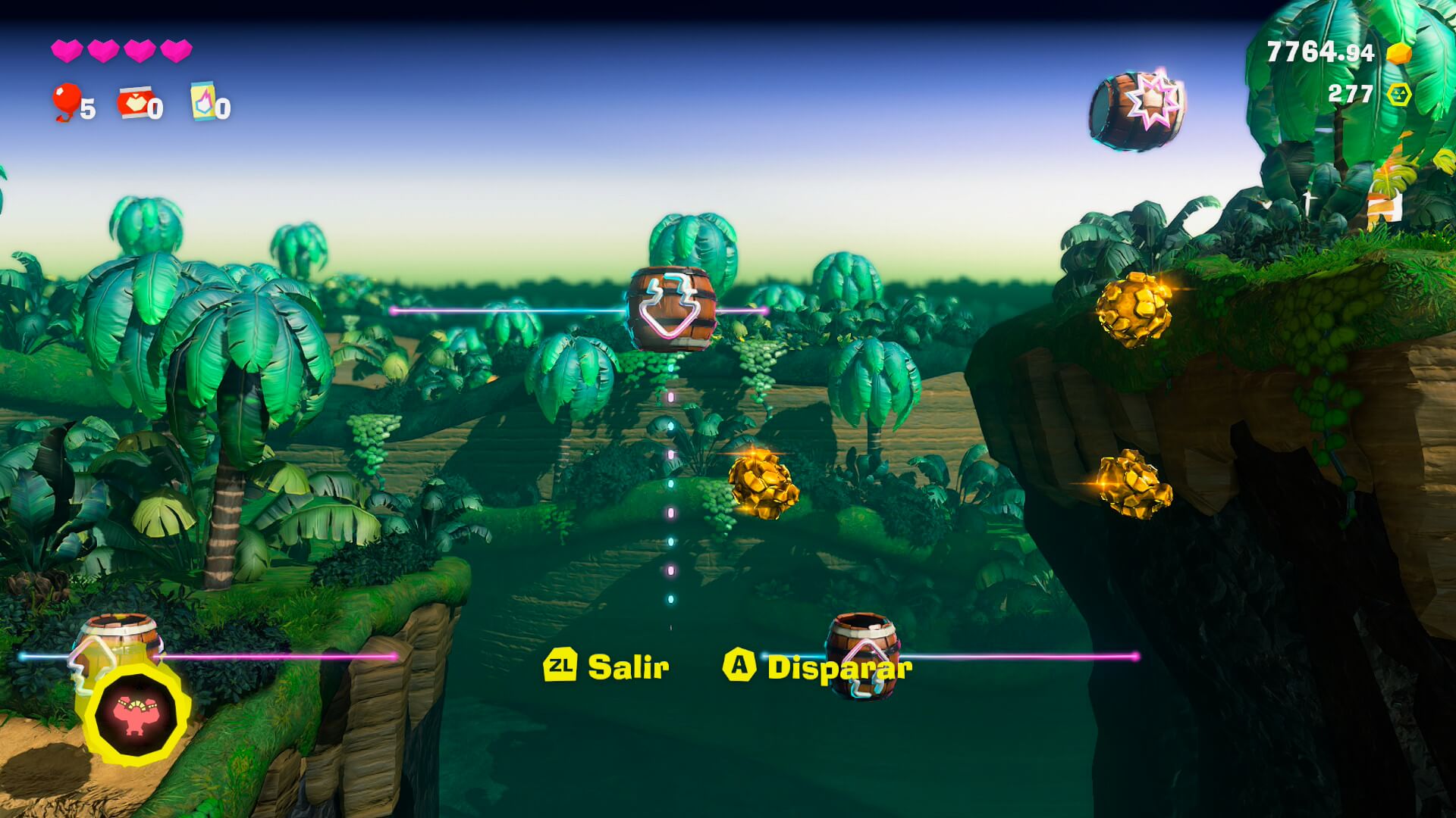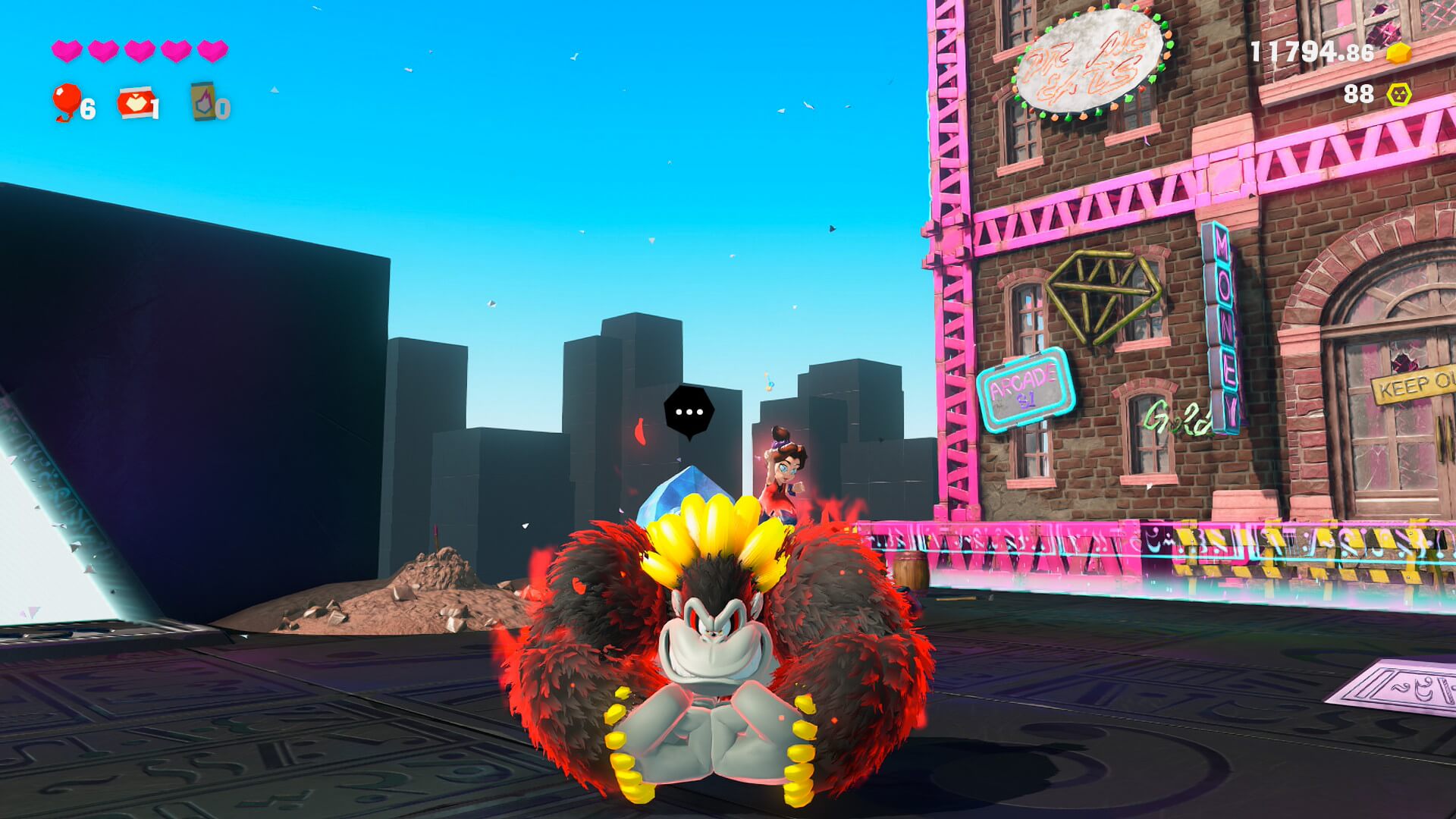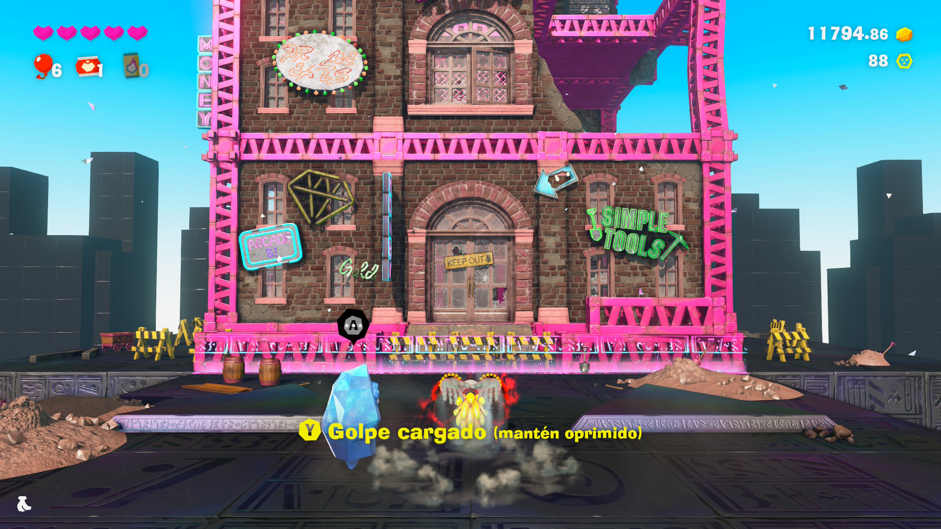 Pero esto nos servirá no sólo para aumentar el porcentaje de material destruído en cada nivel, sino que nos permitirá descubrir diversos ítems que ayudarán a Donkey Kong y Pauline en su aventura. Así, las Gemas de Banandio nos permitirán obtener un punto de habilidad por cada 5 plátanos ingeridos; los fósiles y monedas especiales servirán para adquirir distintos accesorios con beneficios especiales para ambos personajes; y con el oro que juntemos podremos adquirir mapas con ubicaciones de Gemas y fósiles en cada uno de los estratos que visitemos, entre otras cosas. ¿Cómo hacemos para descubrir las ubicaciones de las Gemas y los fósiles se preguntarán? Bueno, nuestro mono favorito puede golpear el suelo con sus palmas resultando en una especie de sonar que nos mostrará la ubicación, siempre en un radio cercano, de cada uno de estos ítems. La gran mayoría del tiempo estaremos rompiendo rocas y golpeando el suelo para descubrir todo, y nos sorprenderá la cantidad de veces que dejaremos la historia de lado solamente para seguir demoliendo.