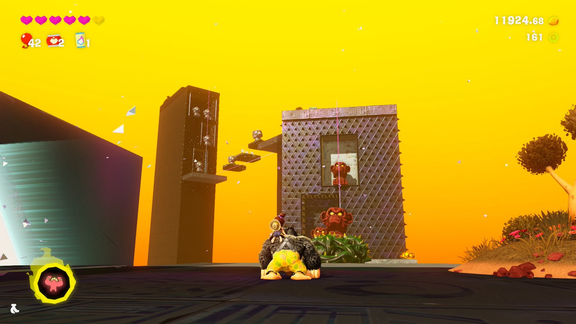 Además, al obtenerlas se ampliará el árbol de habilidades de Donkey Kong, donde cada punto de habilidad se obtiene cada 5 Gemas de Banandio ingeridas, y que nos servirán para mejorar la fuerza o vitalidad de Donkey, el radio del sónar, la fuerza de sus golpes, el tiempo que tarda cada transformación, y mucho más. Esto, sumado a los cambios de vestuario para ambos protagonistar, nos dan un abanico de posibilidades para sortear los desafíos que Donkey Kong Bananza nos presenta.