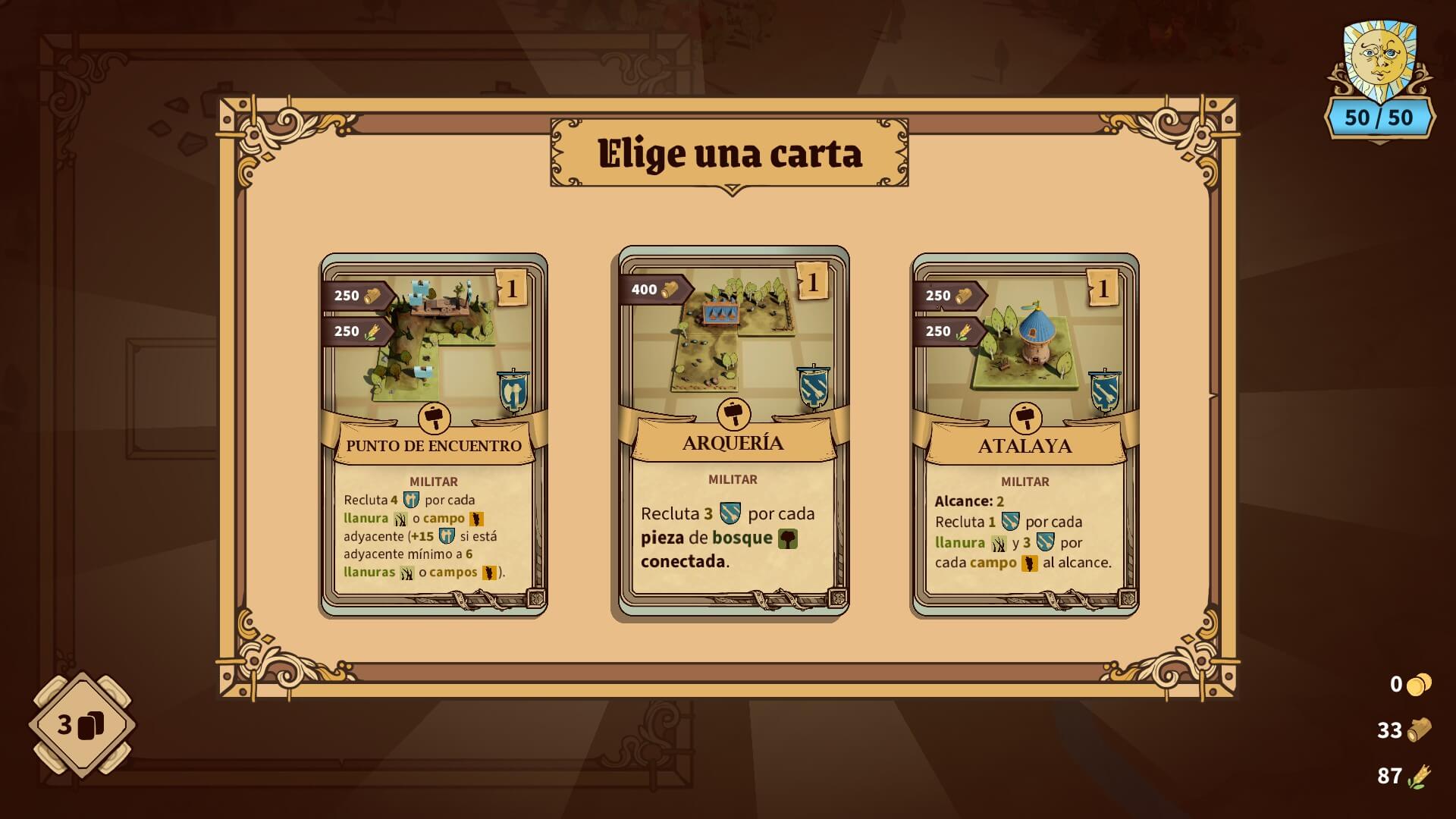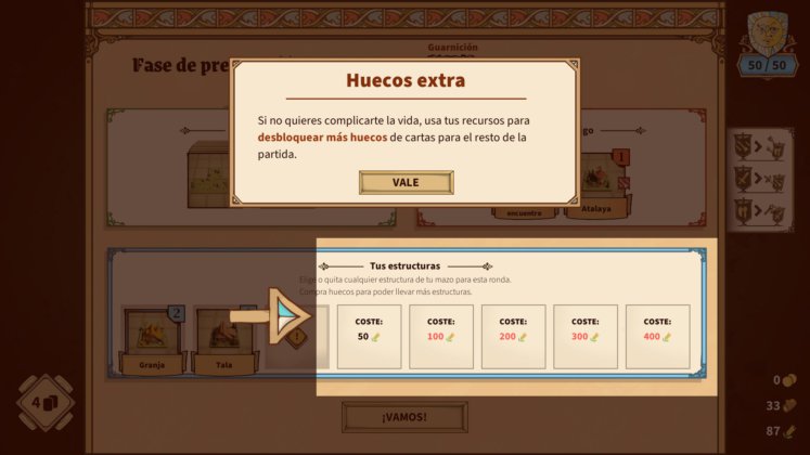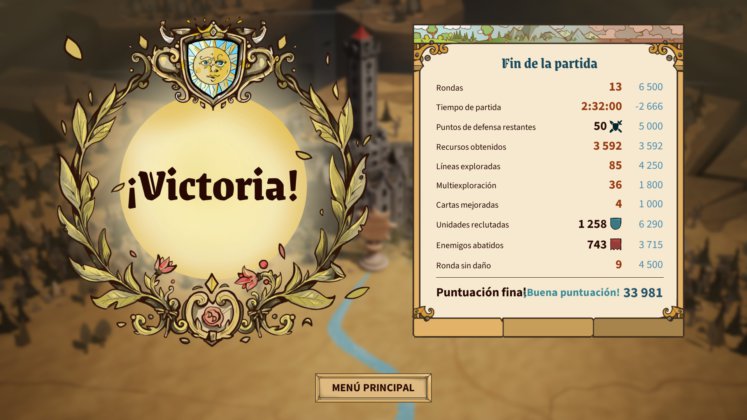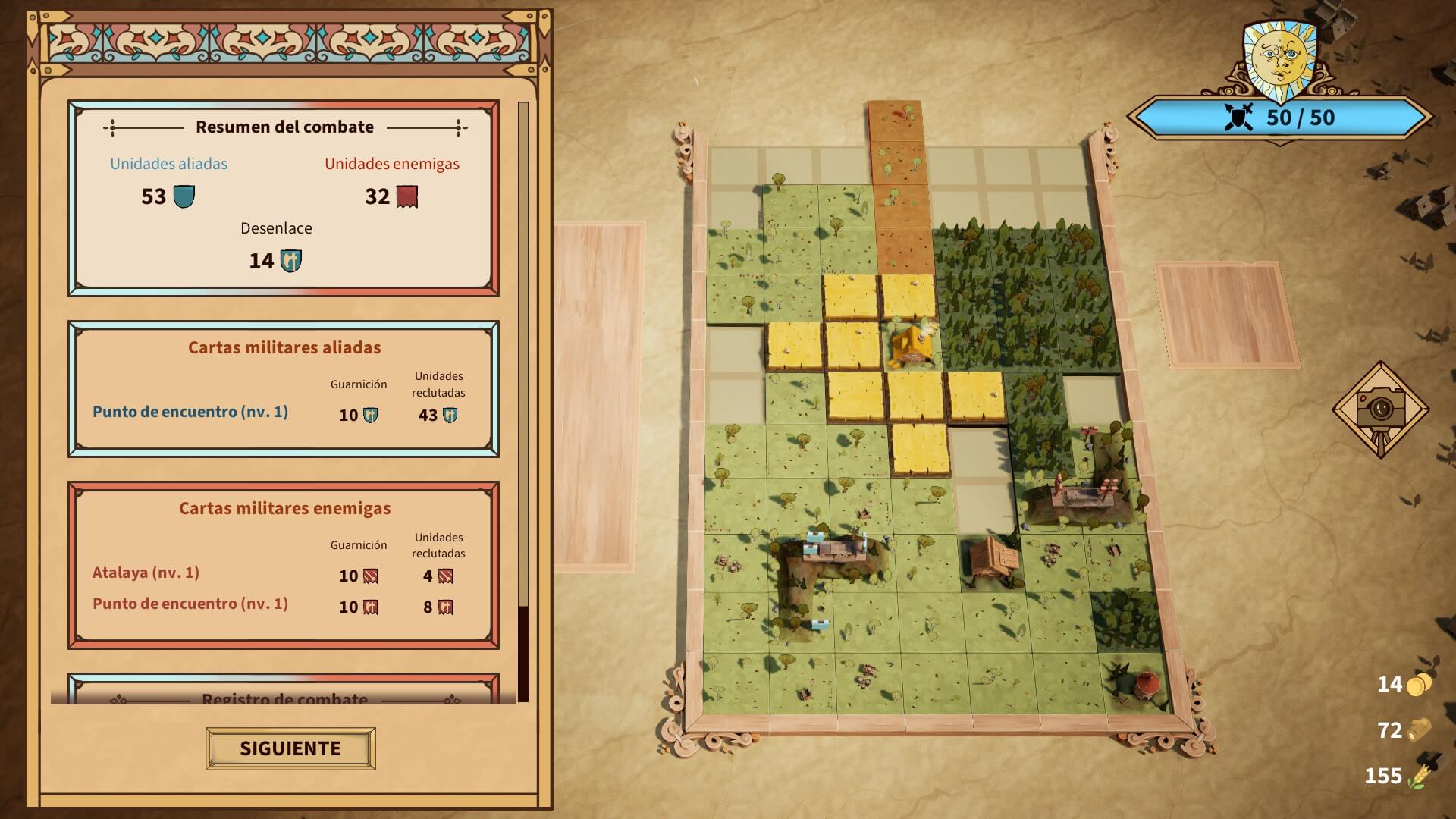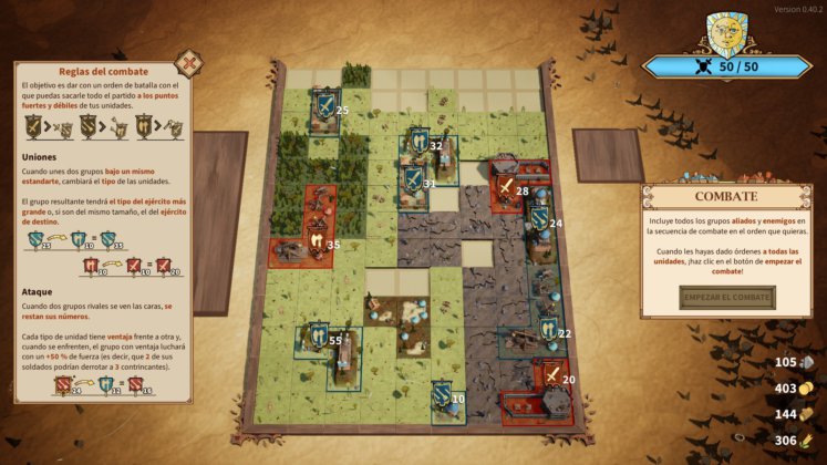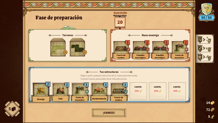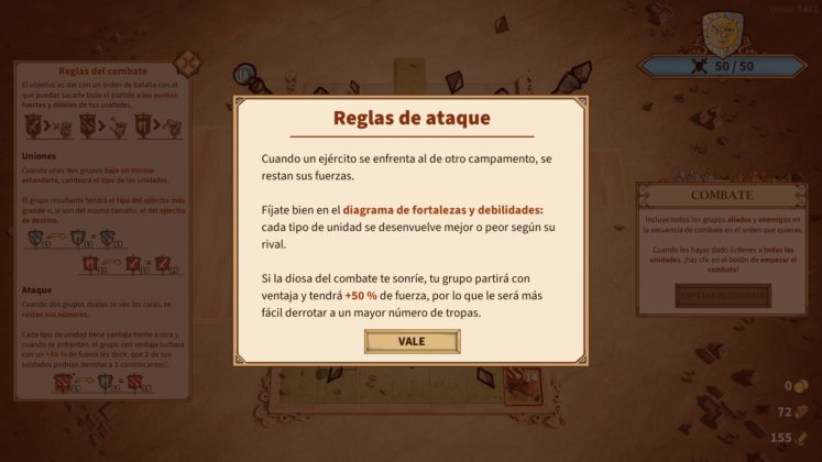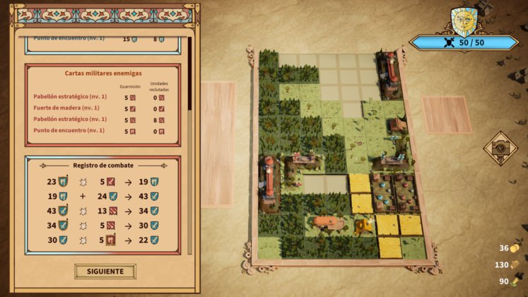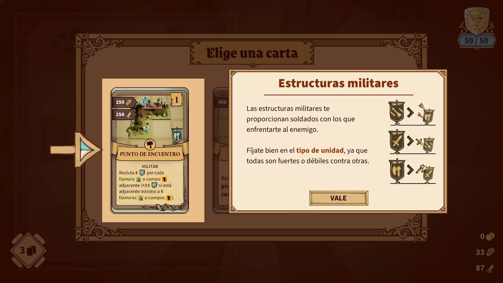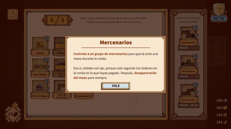 El combate es otro aspecto clave. Durante las partidas, obtenemos cartas de militares que representan unidades como espadachines, arqueros o guerreros pesados con hacha. Cada una tiene ventajas sobre otras en un sistema estilo piedra-papel-tijera, lo que exige considerar cuidadosamente donde vamos a ponerlas en el tablero. Lo favorable aquí es que absolutamente todas las cartas (incluyendo los arsenales enemigos) son dispuestas en juego por nosotros, lo que hace que busquemos el orden correcto que nos sirva, sin afectar a la partida. En varios casos me pasó que olvidara el efecto de alguna ficha enemiga, y justo pusiera al lado algo que la favorece dando más soldados al enemigo.