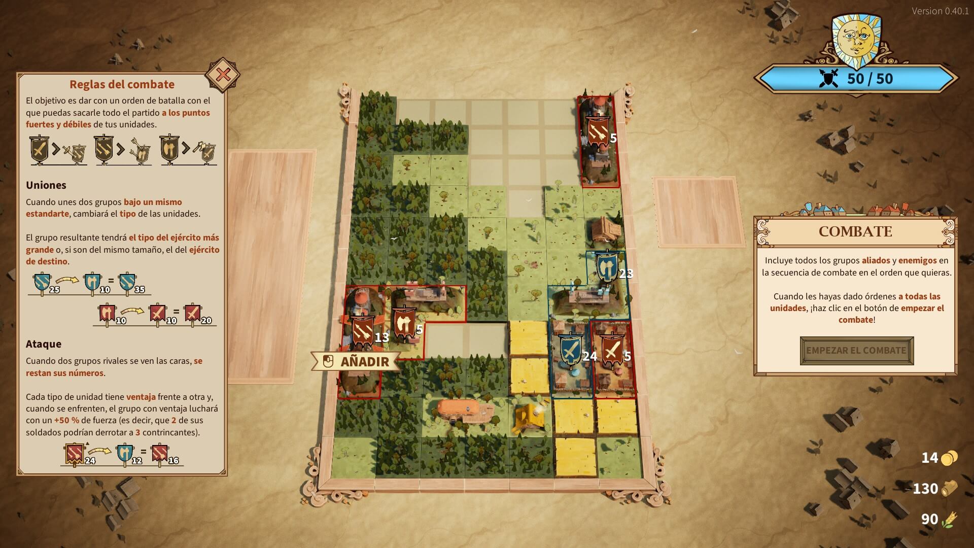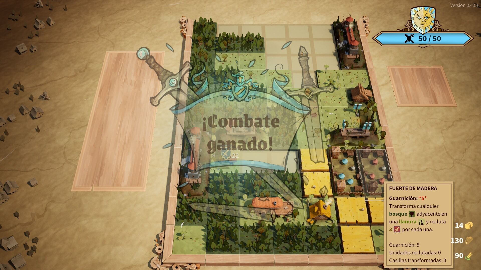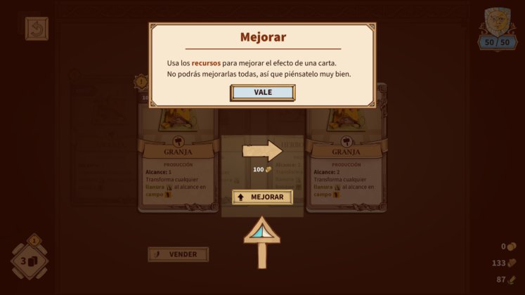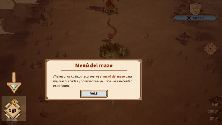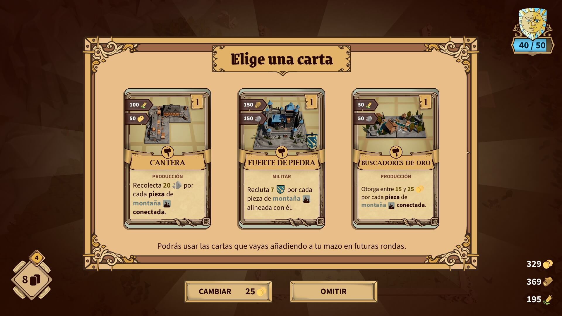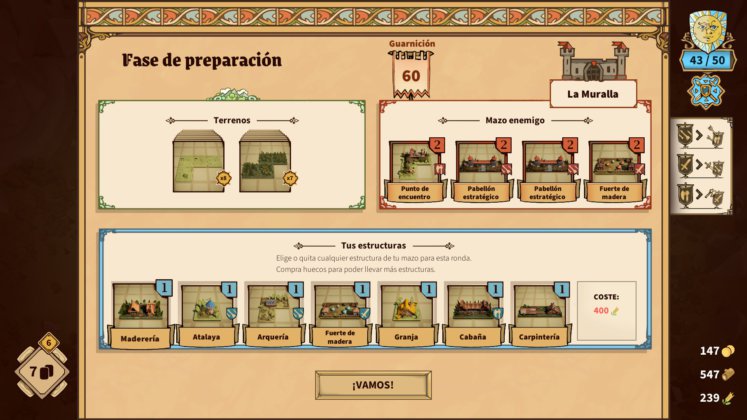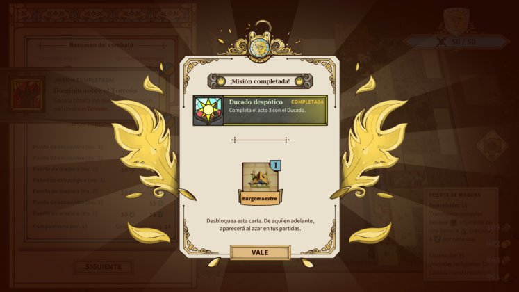 El combate es otro aspecto clave. Durante las partidas, obtenemos cartas de militares que representan unidades como espadachines, arqueros o guerreros pesados con hacha. Cada una tiene ventajas sobre otras en un sistema estilo piedra-papel-tijera, lo que exige considerar cuidadosamente donde vamos a ponerlas en el tablero. Lo favorable aquí es que absolutamente todas las cartas (incluyendo los arsenales enemigos) son dispuestas en juego por nosotros, lo que hace que busquemos el orden correcto que nos sirva, sin afectar a la partida. En varios casos me pasó que olvidara el efecto de alguna ficha enemiga, y justo pusiera al lado algo que la favorece dando más soldados al enemigo.