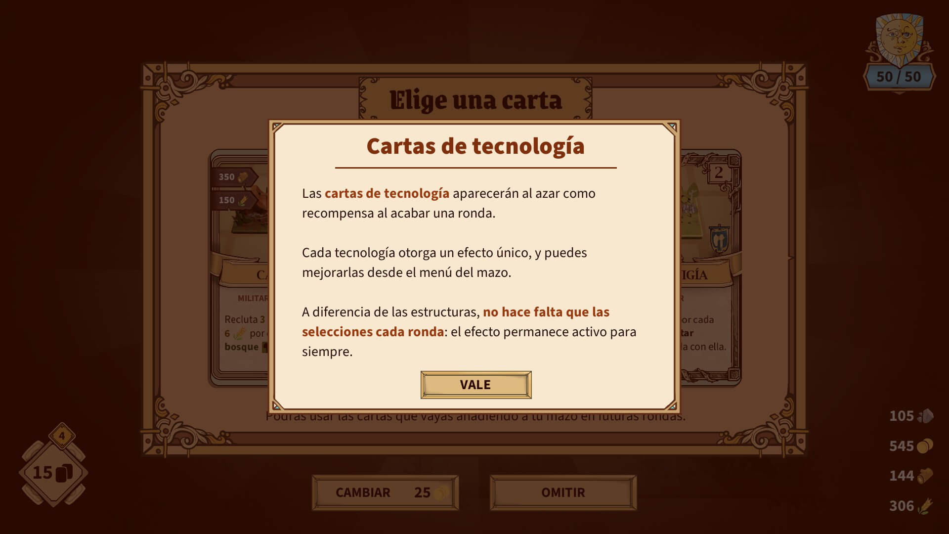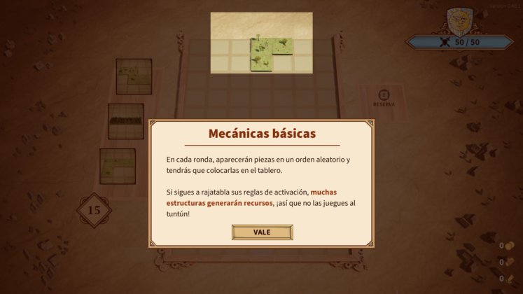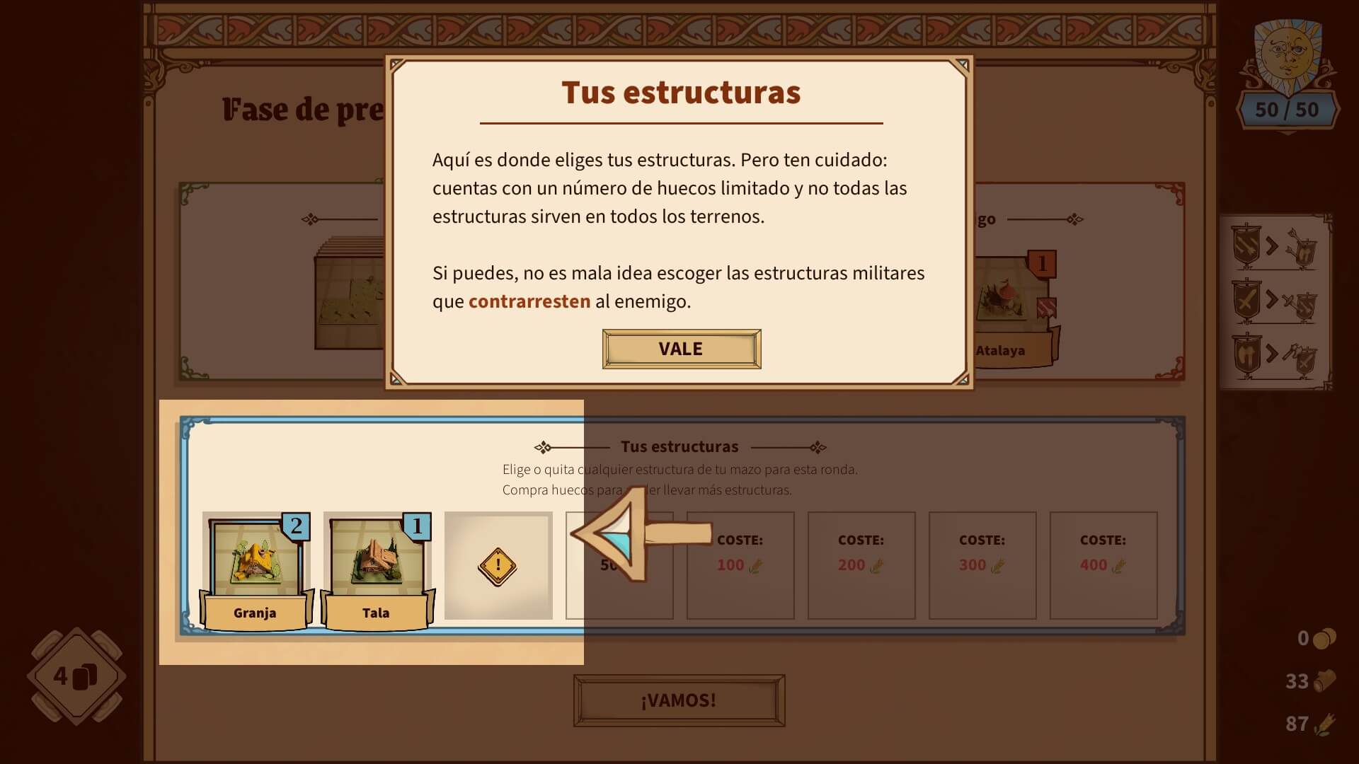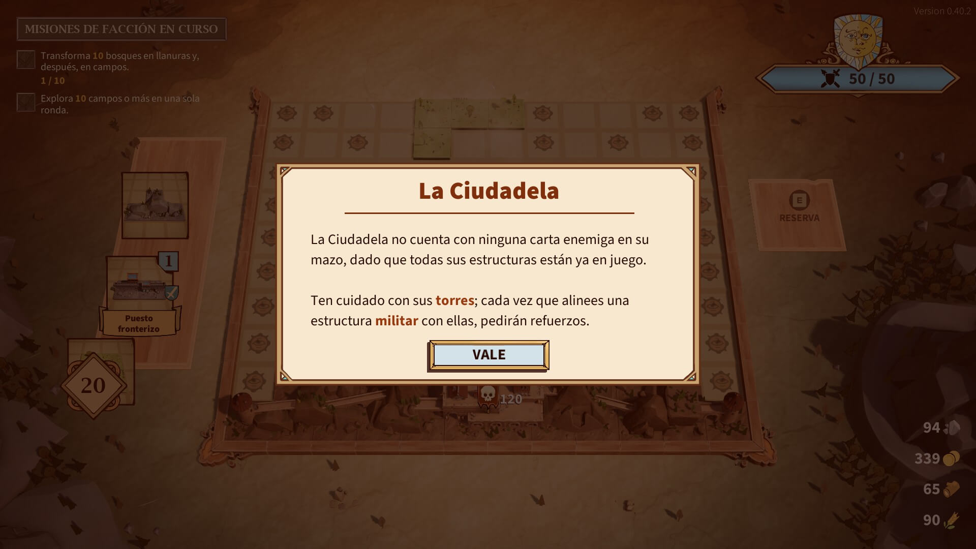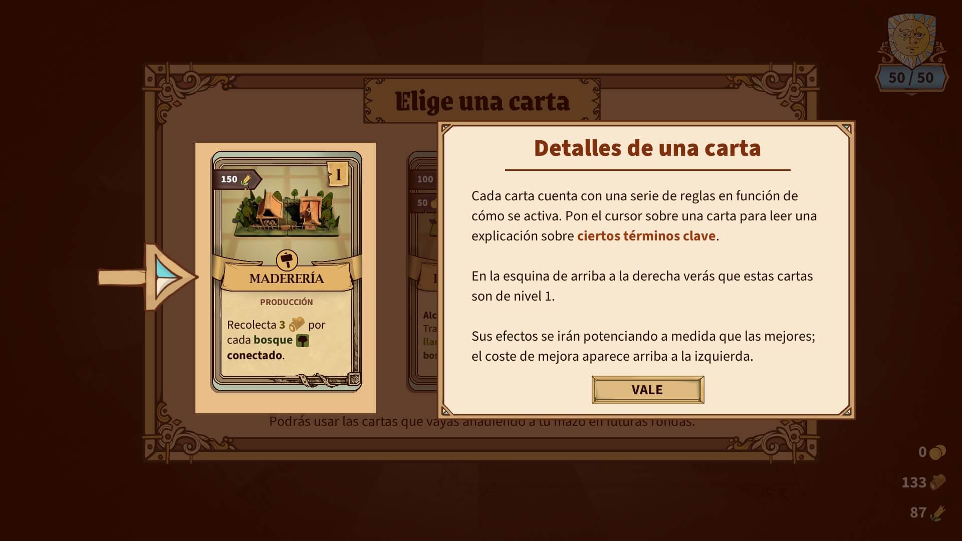 El combate es otro aspecto clave. Durante las partidas, obtenemos cartas de militares que representan unidades como espadachines, arqueros o guerreros pesados con hacha. Cada una tiene ventajas sobre otras en un sistema estilo piedra-papel-tijera, lo que exige considerar cuidadosamente donde vamos a ponerlas en el tablero. Lo favorable aquí es que absolutamente todas las cartas (incluyendo los arsenales enemigos) son dispuestas en juego por nosotros, lo que hace que busquemos el orden correcto que nos sirva, sin afectar a la partida. En varios casos me pasó que olvidara el efecto de alguna ficha enemiga, y justo pusiera al lado algo que la favorece dando más soldados al enemigo.