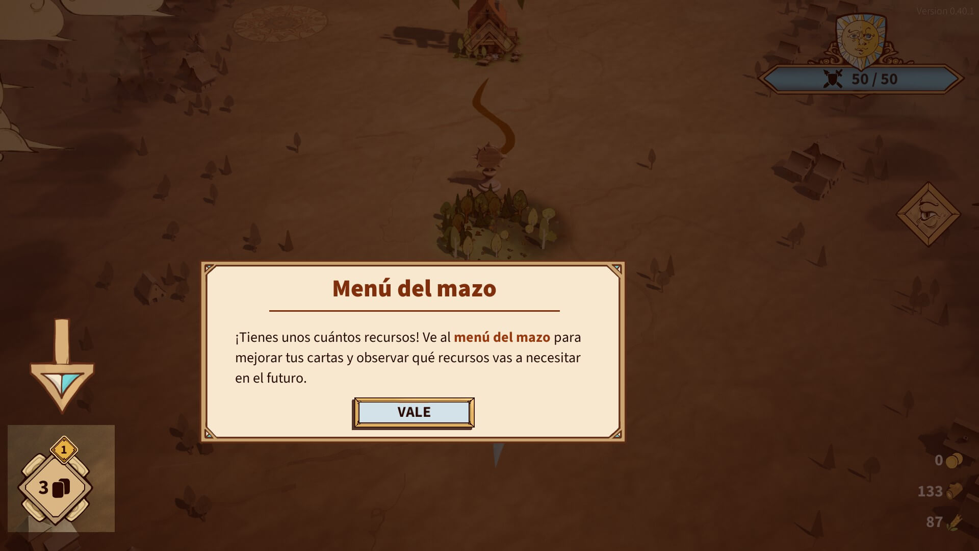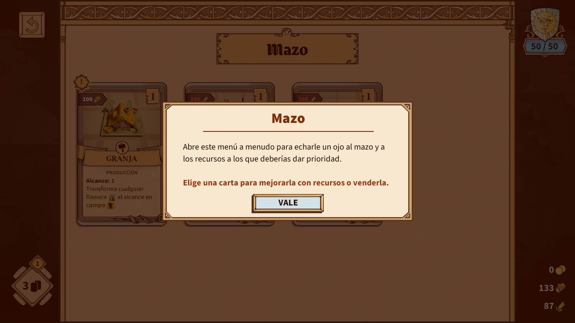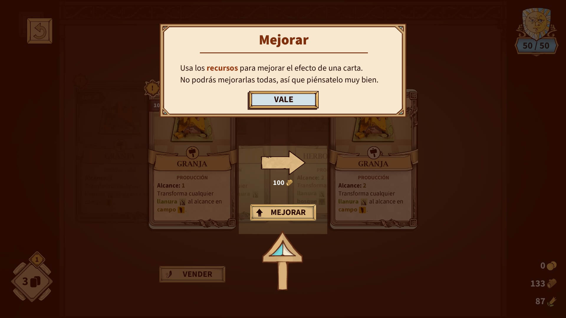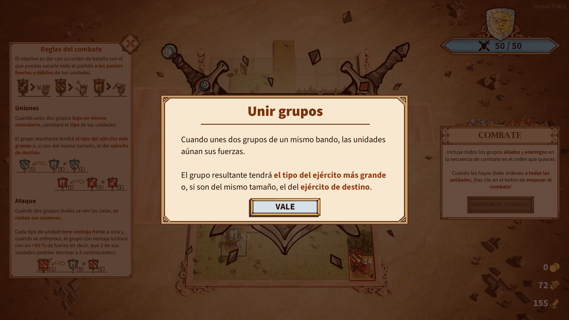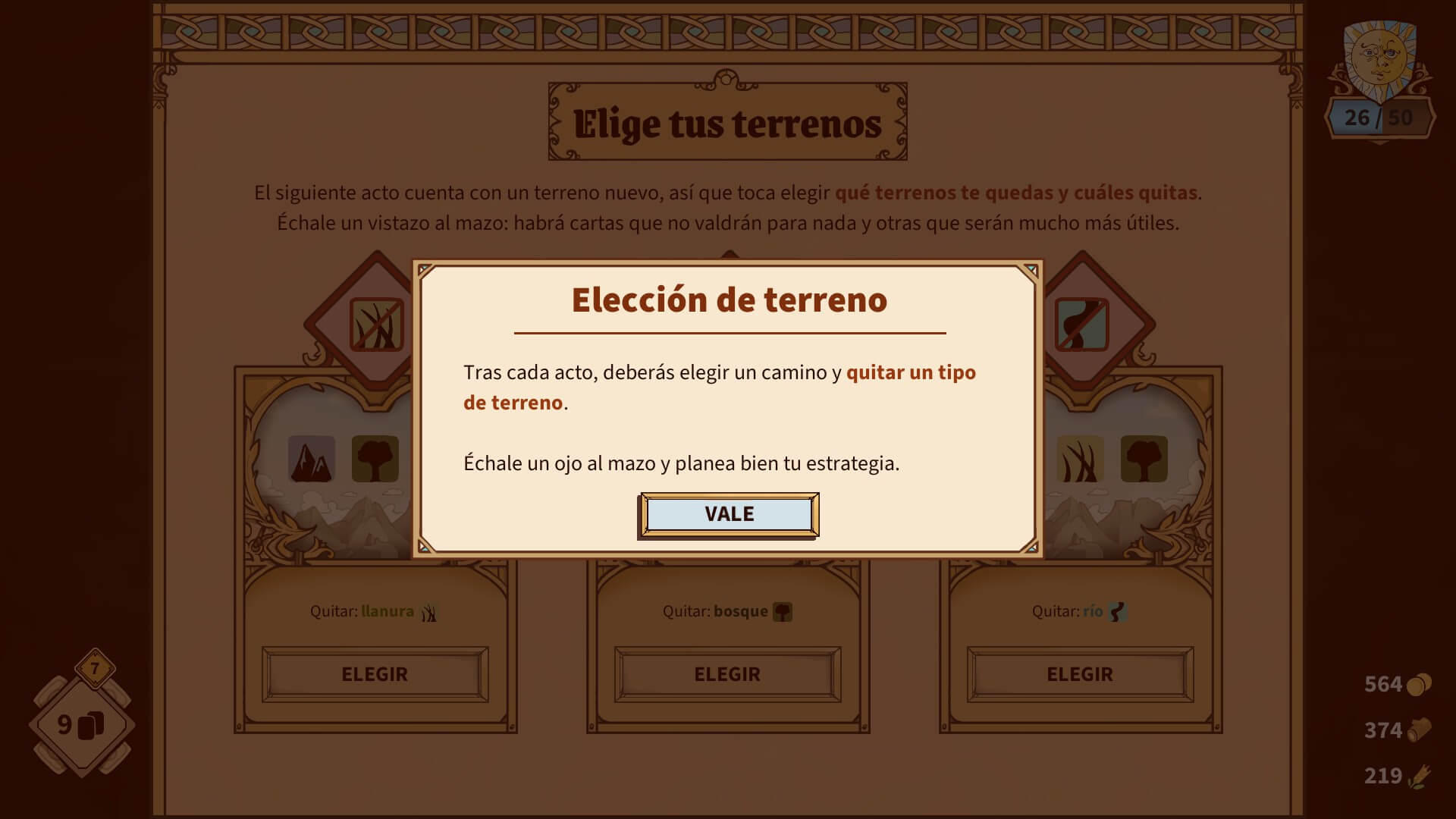 El combate es otro aspecto clave. Durante las partidas, obtenemos cartas de militares que representan unidades como espadachines, arqueros o guerreros pesados con hacha. Cada una tiene ventajas sobre otras en un sistema estilo piedra-papel-tijera, lo que exige considerar cuidadosamente donde vamos a ponerlas en el tablero. Lo favorable aquí es que absolutamente todas las cartas (incluyendo los arsenales enemigos) son dispuestas en juego por nosotros, lo que hace que busquemos el orden correcto que nos sirva, sin afectar a la partida. En varios casos me pasó que olvidara el efecto de alguna ficha enemiga, y justo pusiera al lado algo que la favorece dando más soldados al enemigo.