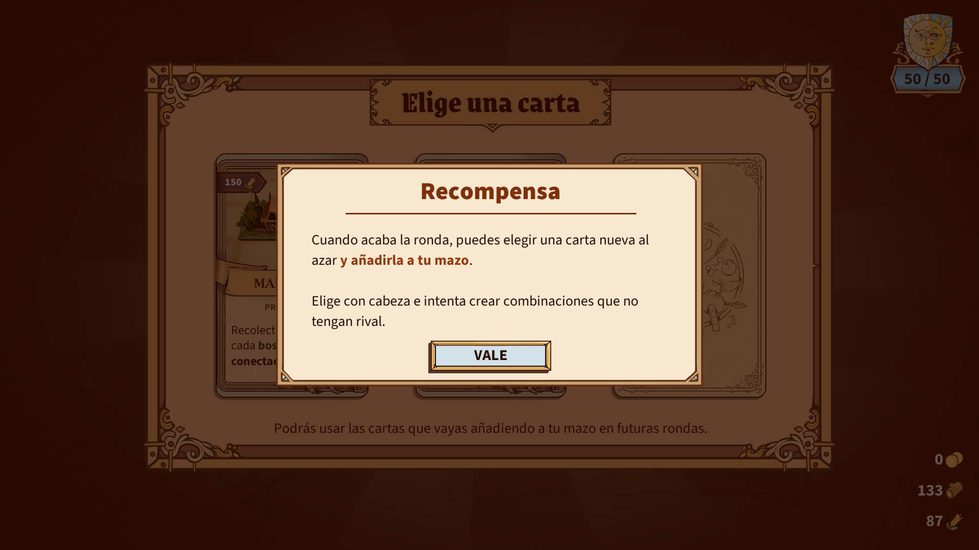 Entre combates y etapas, a medida que vamos ganando, desbloqueamos la posibilidad de mejoras pasivas o nuevas cartas para el mazo, ampliando las posibilidades de construcción y de hacer estrategias. Esta mecánica de deckbuilding está limitada por la cantidad de espacios disponibles, como mencioné anteriormente, donde solo 8 pueden ser utilizadas. Algo interesante aquí es que en la medida que tenemos victorias o cumplimos misiones (algunas por facción, y otras generales), podemos subir en el árbol de desbloqueos y tener inmediatamente una repercusión sobre la partida, a diferencia de otros roguelikes donde hasta no iniciar una nueva estaremos atados de manos.