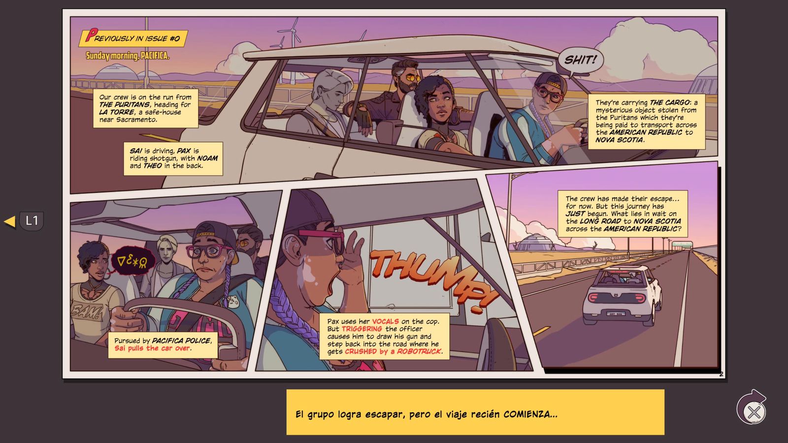 Como les dije, no vamos a entrar en spoilers, pero si vamos a hablar un poco del prólogo y sobre qué trata el juego. Controlaremos a Pax, una estafadora, exiliada y ex convicta que es contratada para trasladar un paquete desde Pacifica hasta Nueva Escocia a través de la República Americana controlada por Justicia. Pero no lo hará sola, ya que tendrá a su equipo de (también) parias que la acompañarán en cada paso y en quienes deberemos apoyarnos en muchos momoentos. Estados Unidos ya no es los EEUU que conocemos, sino que ahora se llama “República de América” o “La República”. Los estados individuales fueron modificados después de un evento llamado “La Transmisión”, y ahora hay 6 regiones administrativas, cada una supervisada por su propio Magistrado de Justicia. Los robots son una parte esencial de este nuevo mundo, con grupos que están a favor y en contra de su inserción en la sociedad, como veremos a lo largo del juego.