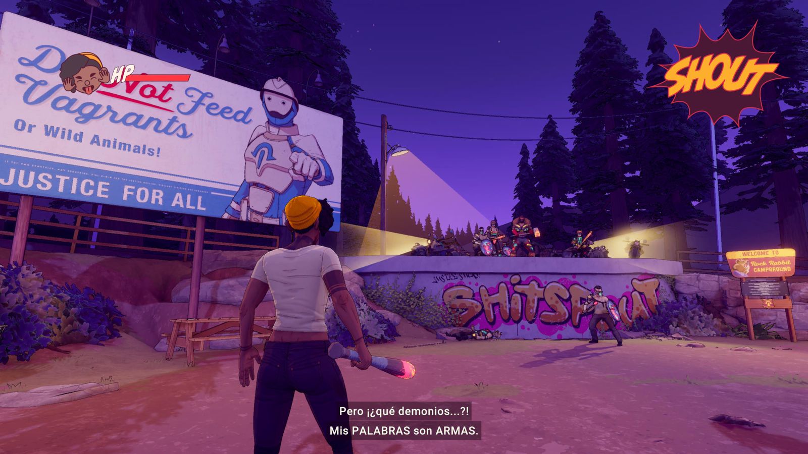 Si, Dustborn tiene combate! Pero no esperen que sea algo fuera de lo común. Pax tendrá un bat de baseball con el que combatirá a los enemigos, pero lo combinaremos con el poder de sus palabras. Así, podremos intimidar a nuestros enemigos para que dejen de moverse, alejarlos o bien hacer que se peleen entre ellos. Mientras esto sucede, podremos golpearlos con combos que podremos mejorar en un árbol de habilidades escueto. Además, para los enemigos en altura, podremos lanzar el bat que volverá automáticamente a nuestra protagonista. Ya verán cómo y por qué, para evitar spoilers. Además, podremos fijar enemigos para centrar nuestros ataques, pero esto a veces resultará complicado por una cámara que no termina de hacer bien su trabajo, sin entender muchas veces qué enemigo se encuentra fijado.
