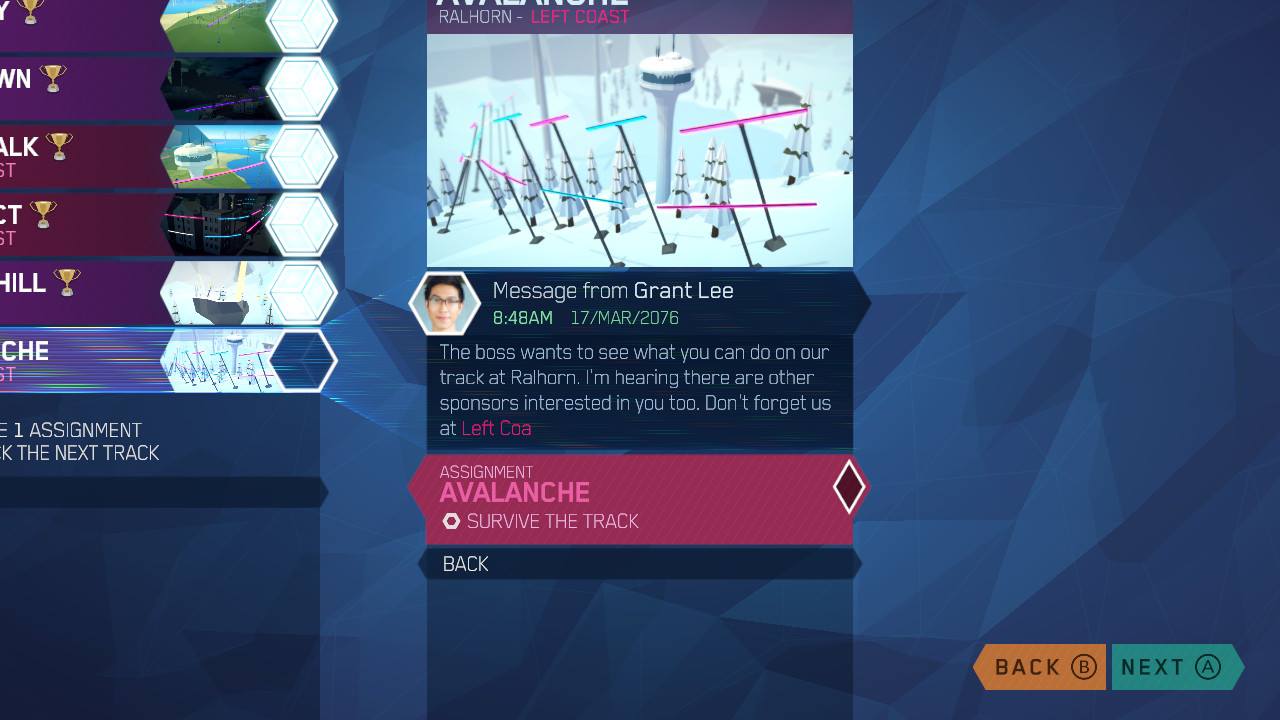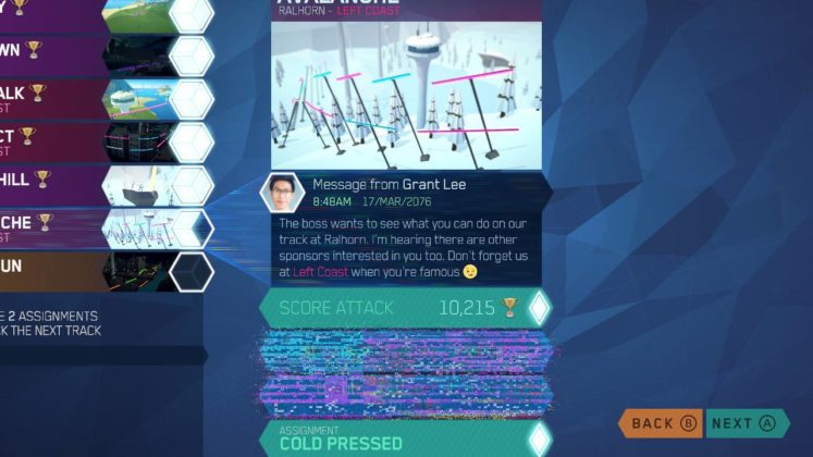 Entre niveles, recibes mensajes de personajes que trabajan en la compañía que desarrolla tu motocicleta. Afortunadamente, no son intrusivos en la experiencia y son fáciles de saltear para aquellos que solo quieren jugar el juego, pero al mismo tiempo, tienes la opción de leerlos y sumergirte en un poco de narración ligera, si esa es tu clase de cosas También vale la pena decir que, definitivamente, comencé a disfrutar el juego mucho más a medida que aumentaba el desafío, con el encadenamiento de trucos, las ruedas de cambio de color y otras mecánicas que condicionaban aún más la jugabilidad de lo que se mencionó anteriormente.