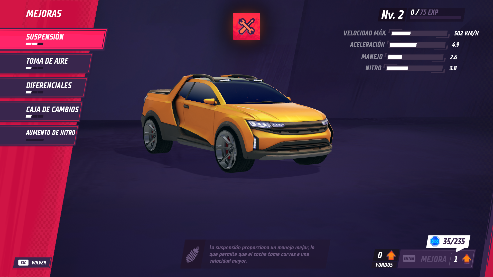 El juego comienza con cuatro vehículos, cada uno con diferentes características, lo que te permite adaptar tu estilo de juego. Las mejoras se obtienen ganando carreras y recolectando monedas azules, lo que antes comenté. Así mismo, a medida que competimos obtenemos experiencia que permite subir los niveles del vehículo, y si esto no podremos aplicar ninguna de las mejoras por más que tengamos las monedas suficientes (cosa que no suele ser común).