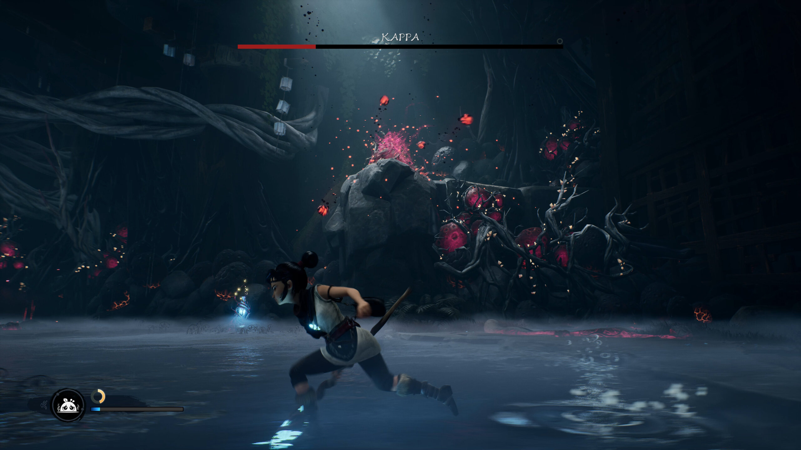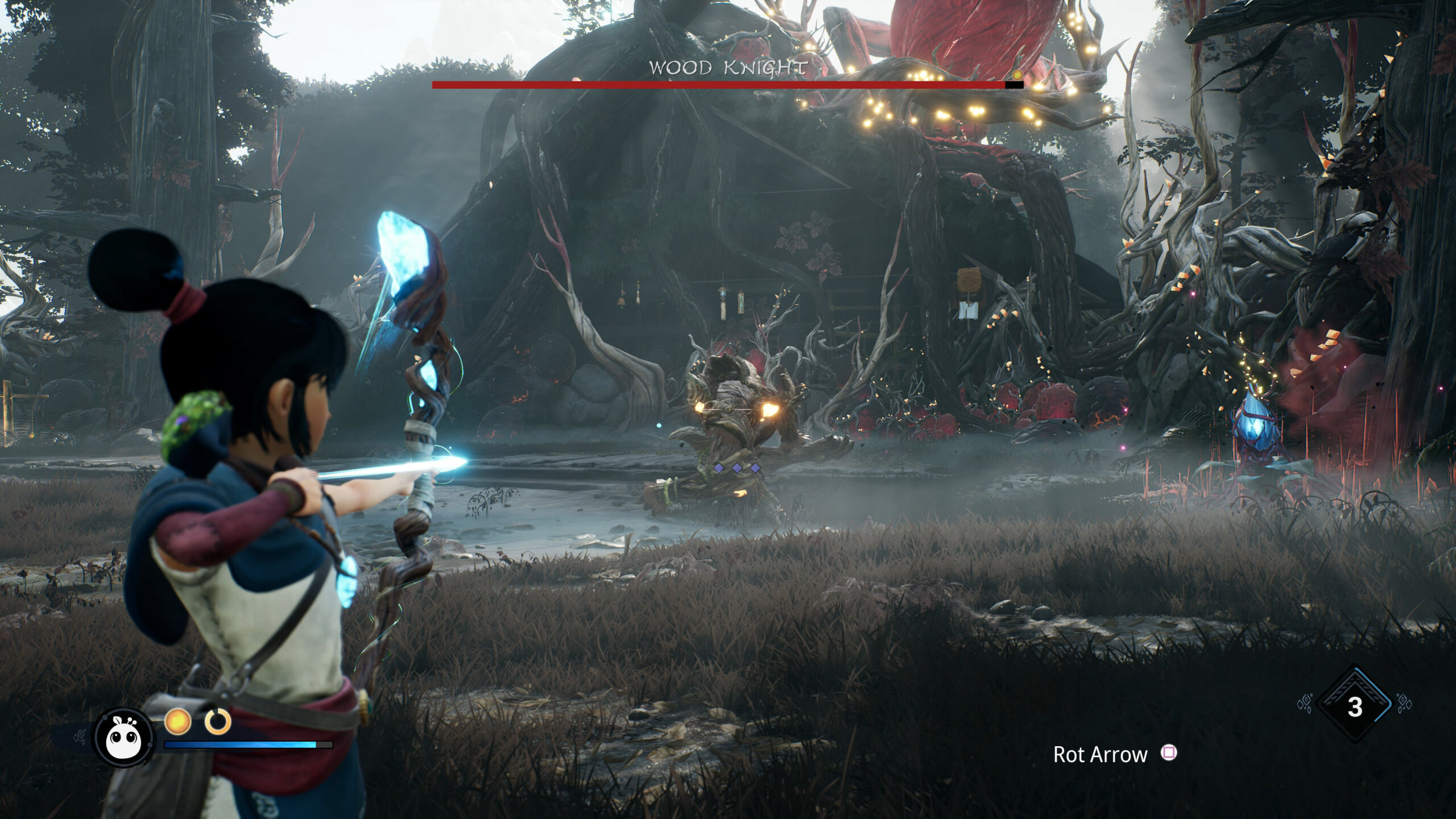 Los Rot juegan un papel crucial en la mecánica del juego, ya que pueden ser utilizados para interactuar con el entorno, activar mecanismos y ayudar en el combate. La forma en que estos pequeños espíritus se integran en la jugabilidad es uno de los aspectos más encantadores del juego. Comenzaremos con uno solo, pero a medida que avancemos en la historia, descubramos secretos y demos vuelta cada una de las piedras del mundo (literalmente), nuestro número de Rots irá subiendo considerablemente. Además de asistirnos en batalla, serán nuestros espectadores de lujo, ya que en muchas oportunidades se teletransportarán a un lugar más cómodo y se quedarán mirando a Kena hacer lo suyo. Se sentarán en mesas, se pararán sobre una piedra para tener una mejor vista del paisaje o simplemente te ayudarán a resaltar las áreas que deberías explorar. Además, podremos personalizarlos agregándoles sombreros, siempre eligiendo el mejor para nuestro Rot favorito.