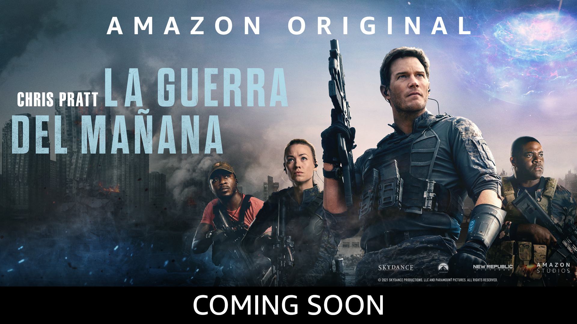 “En La Guerra del Mañana, el mundo se sorprende cuando un grupo de viajeros en el tiempo llegan desde el año 2051 para traer un mensaje urgente: treinta años en el futuro, la humanidad está perdiendo una guerra mundial contra una mortal especie extraterrestre. La única esperanza de sobrevivir es que los soldados y civiles del presente sean transportados al futuro y se unan a la batalla. Dentro de los reclutados está el maestro de secundaria y hombre de familia, Dan Forester (Chris Pratt). Determinado a salvar al mundo para su joven hija, Dan se une a una brillante científica (Yvonne Strahovski) y su distante padre (J.K. Simmons) en una desesperada búsqueda para reescribir el destino del planeta”