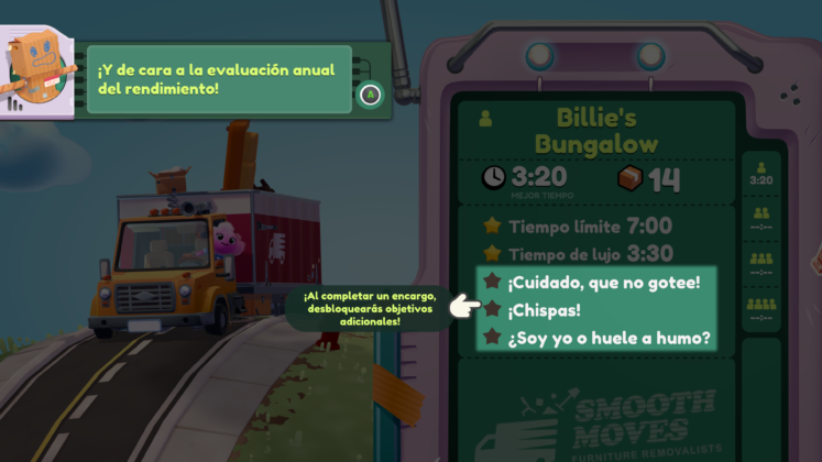 Los niveles iniciales actúan como guía o tutorial. Nos enseñan los tips básicos de cómo recolectar objetos y llevarlos al camión de mudanzas, así como las diferencias entre los objetos frágiles y aquellos que podremos revolear a troche y moche. Esto reafirma que si bien somos mudanceros ordenados, a veces la desprolijidad en virtud de lograr nuestro mejor tiempo, puede ser muy útil.