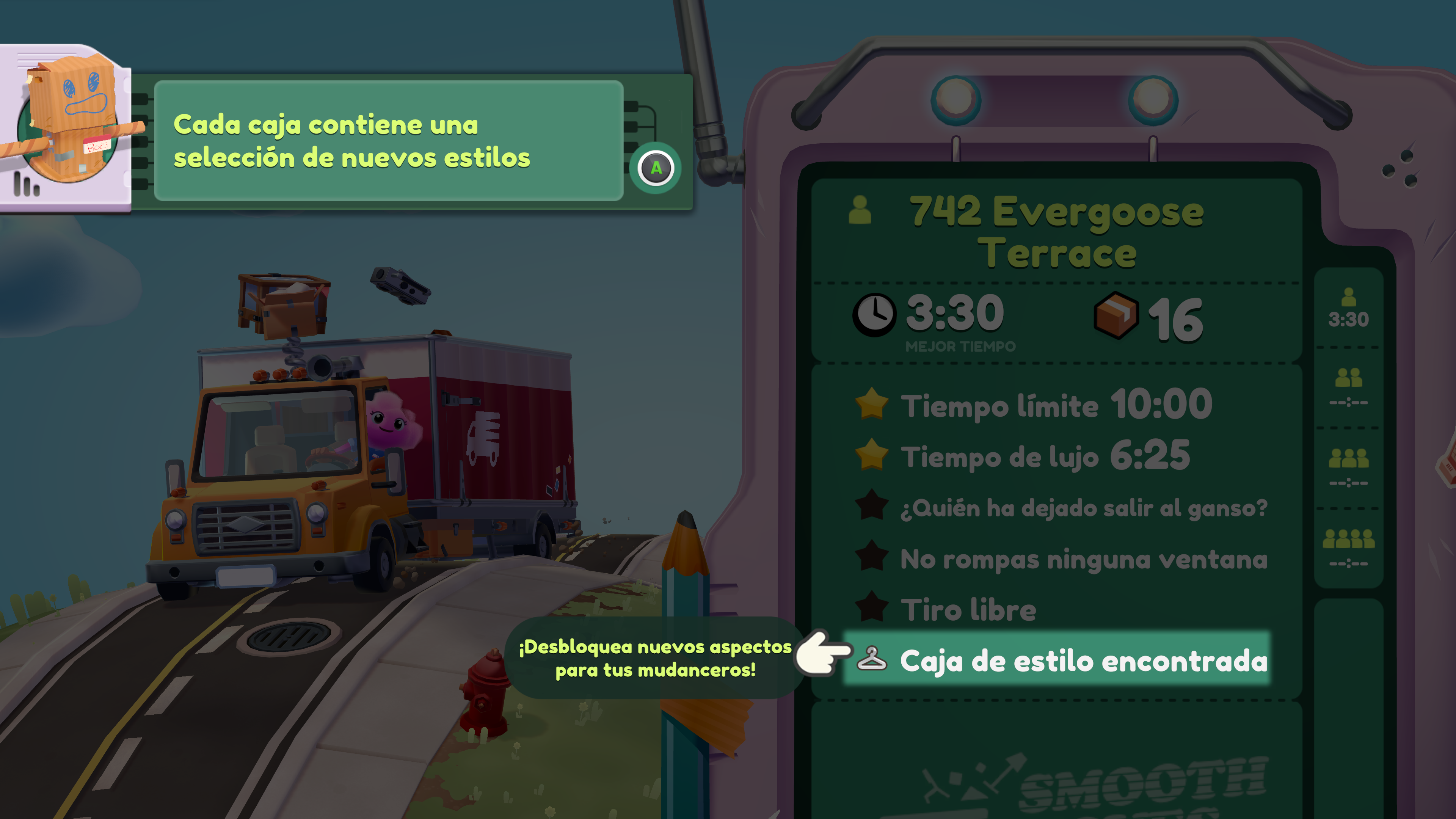Cada nivel tiene como objetivo principal uno: mudarse antes de una X cantidad de minutos. Como sucedía en su antecesor, si nos mudamos velozmente recibimos una recompensa de dos estrellas, y si lo hacemos con un poco más de pereza, solo una. Si queremos sacar a relucir nuestras grandes habilidades de mudancero, podremos jugar nuevamente el nivel para completar objetivos adicionales que van desde no romper vidrios en la casa que estamos mudando (¡Perfect!), hasta interactuar con ciertos artefactos o personajes del entorno.