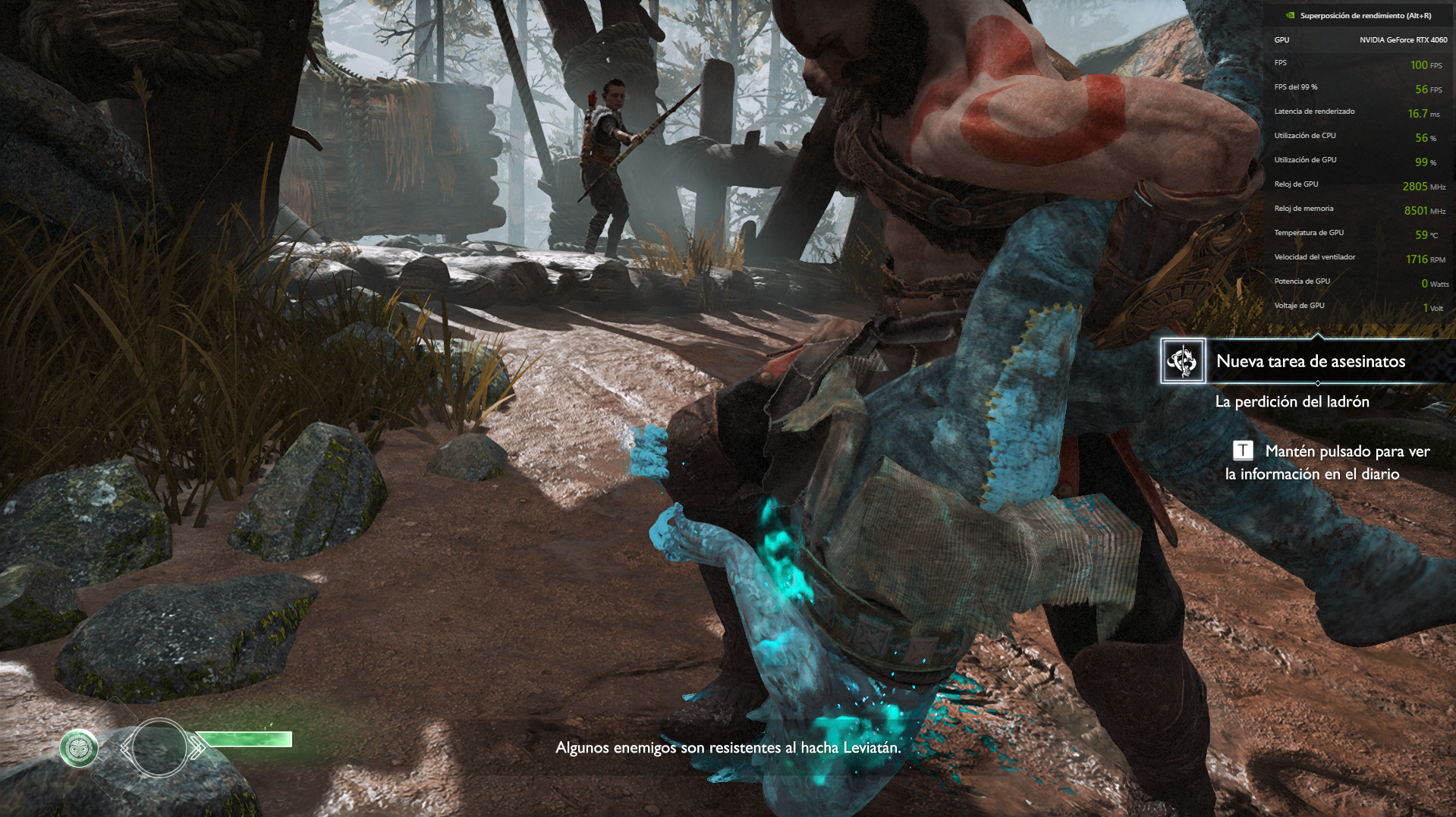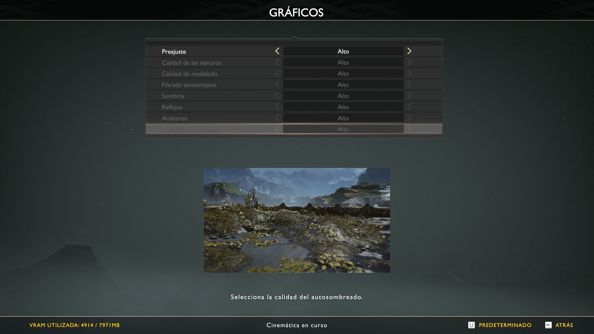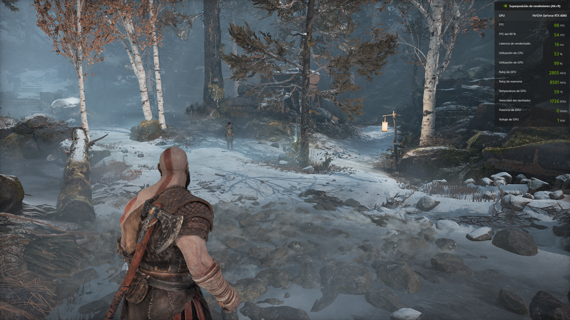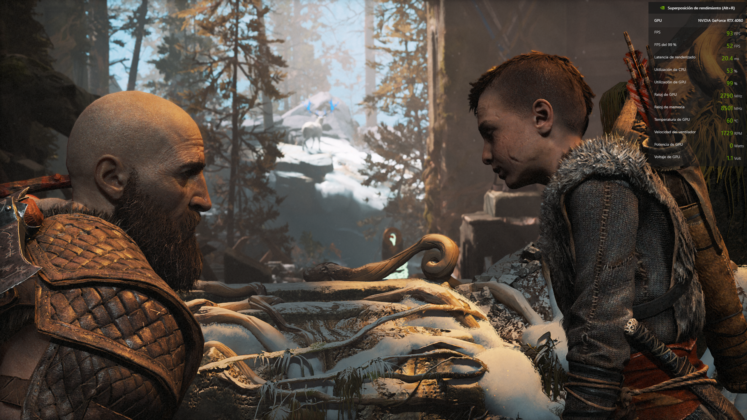 En primera instancia probamos God of War en una configuración según se puede ver en la imágen debajo, que presentó un rendimiento nunca por debajo de los 90 FPS, con promedio en 110 FPS, inclusive en las escenas de batalla, con varios enemigos alrededor.