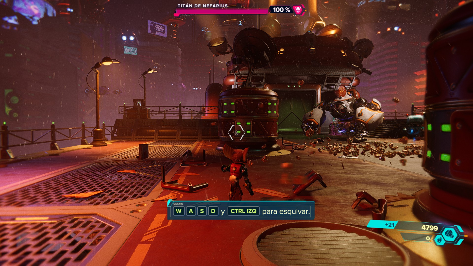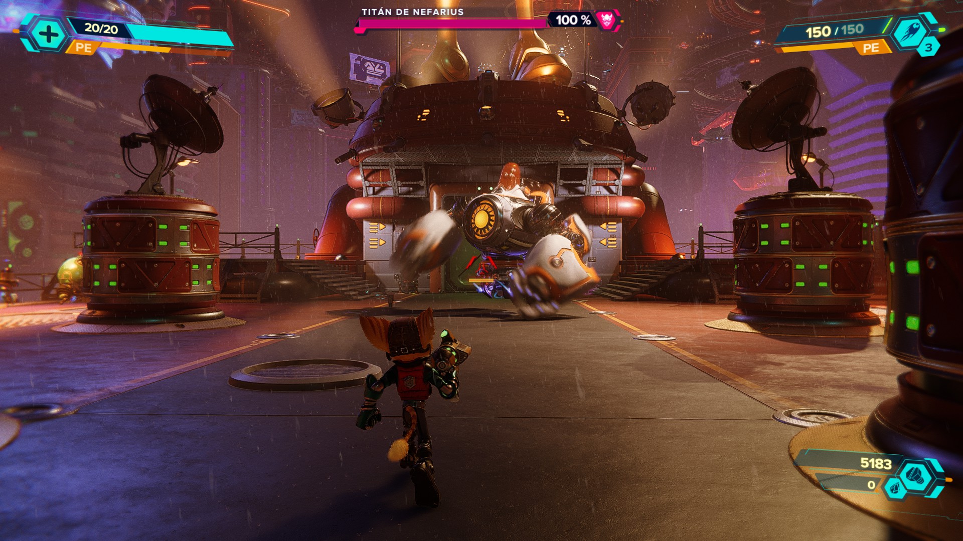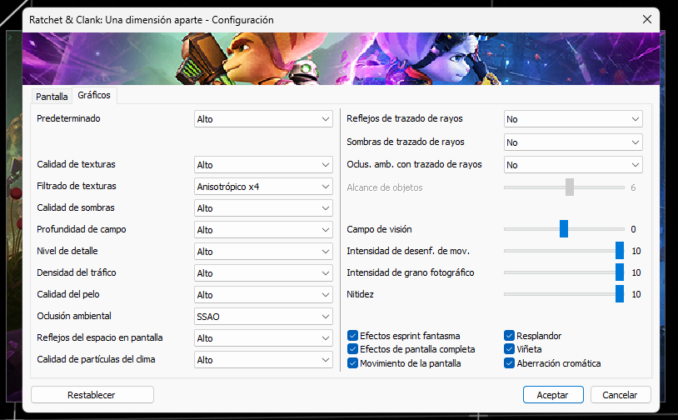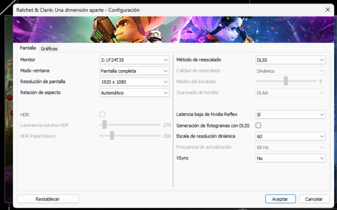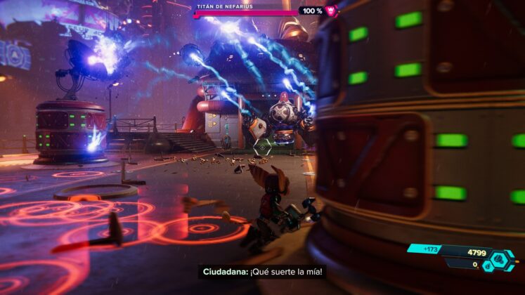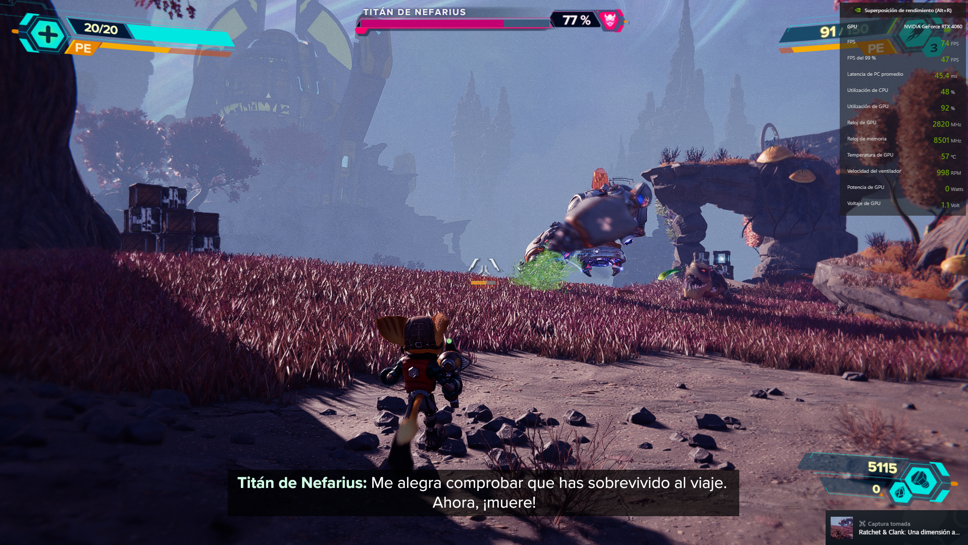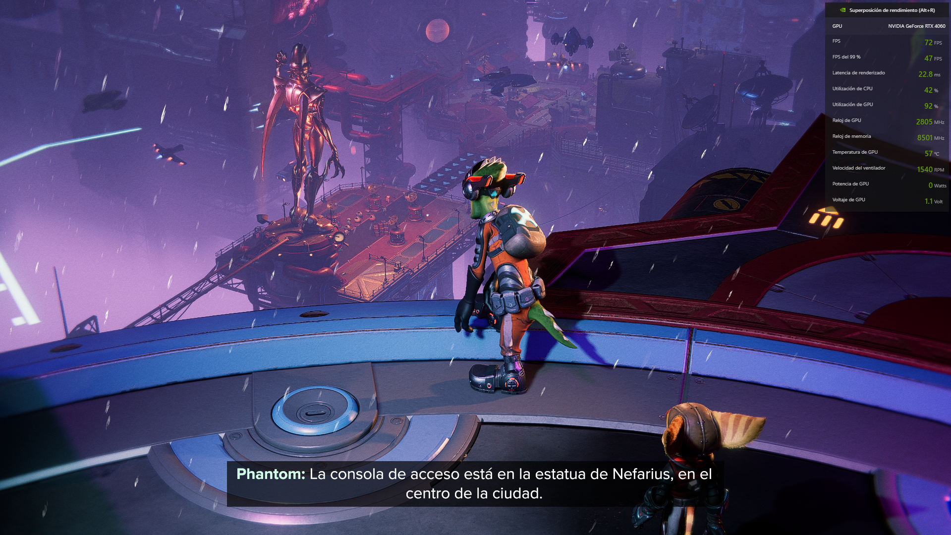 Por el lado del Ratchet & Clank: Rift Apart, se encontraron algunas dificultades que podrían estar asociadas al cuello de botella en el procesador del setup utilizado. Con la configuración activa de NVIDIA Reflex y Ray Tracing también, el título en una escena de pelea con muchas partículas alrededor, explosiones y movimientos de cámara bruscos, bajaba del estándar de 60 FPS para bordear los 55 FPS. También se notaba un mayor esfuerzo para la tarjeta en este título, más nuevo y exigente, ya que la temperatura llegó a un tope de 69°C.