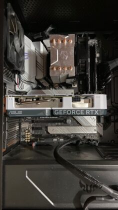 Por empezar noté lo liviana que es al momento exacto en que cambié mi RTX 3080 para instalarla en mi setup. Con dos ventiladores, carcasa plástica dura de color blanco (hay versión negra), se sentía una pluma. Esto tiene correlación con el consumo de energía que posee, que requiere de un solo conector de 8 pines, frente al doble en la 3080, y promedia los 130w de uso normal. Así mismo produce que los niveles de temperatura siempre hayan estado por debajo de los 67 grados, inclusive al momento de correr títulos demandantes.