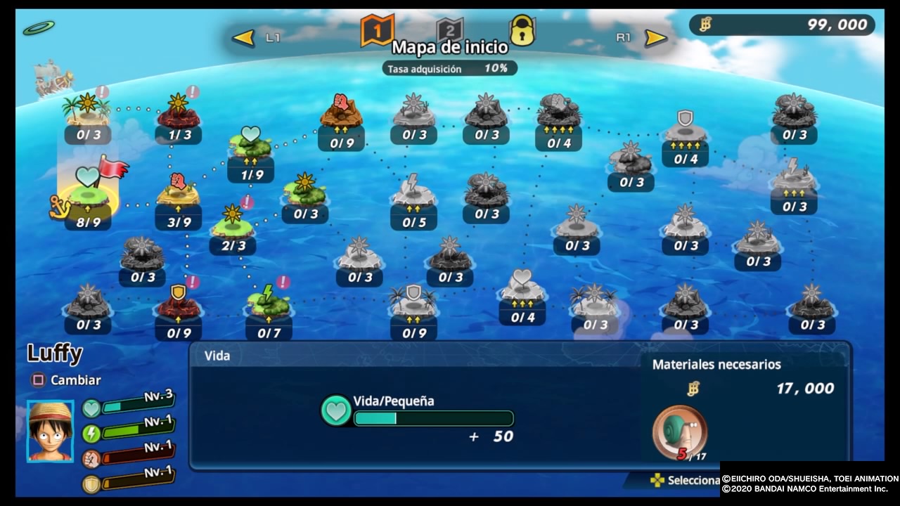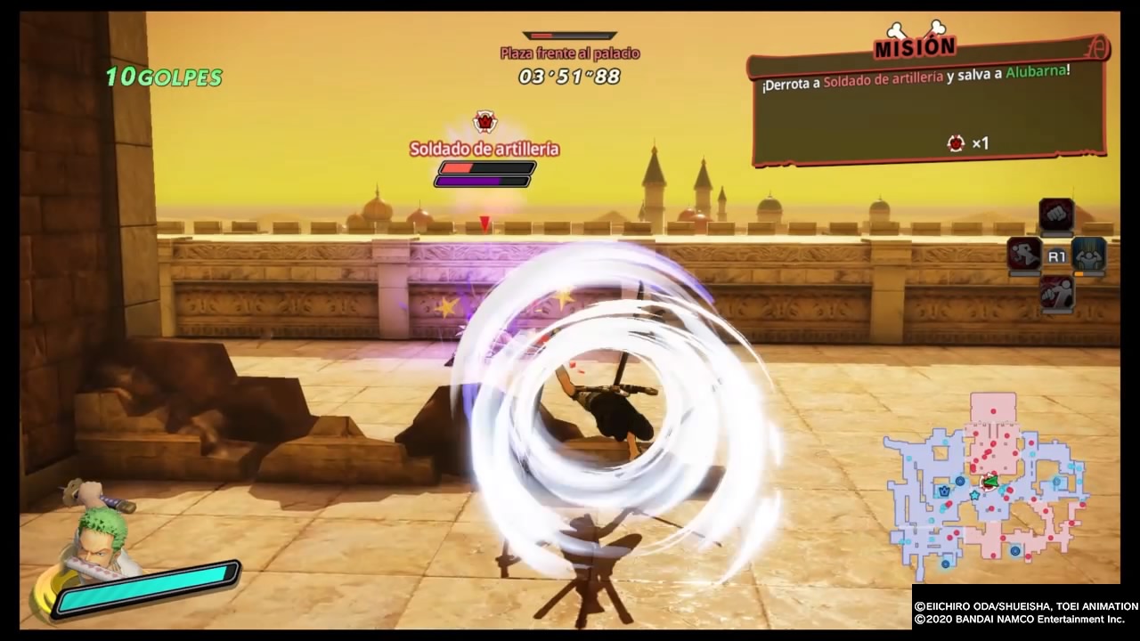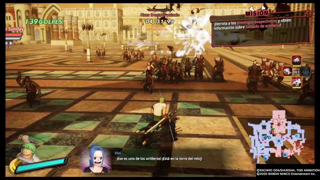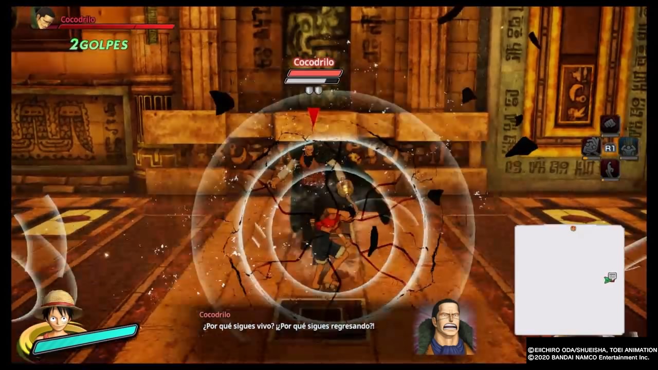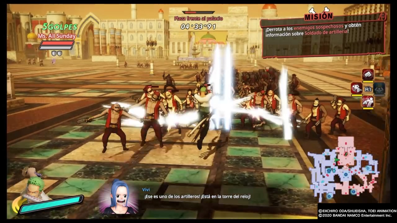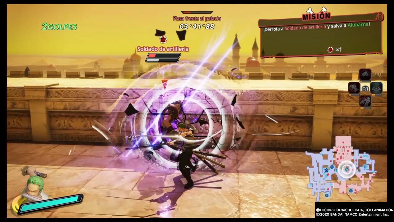 En cuanto al apartado gráfico debo decir que me gustó mucho, se nota que dio un salto notorio respecto a los anteriores. Los diseños de los personajes son realmente muy buenos, las escenas animadas están bien logradas, y los escenarios cuentan con buenos diseñados. No note caídas de frames groseras pese a la cantidad de enemigos en pantalla, se podría decir que en este apartado cumplen como de costumbre. Por su parte la banda sonora es excelente, nos acompañan las melodías características de la franquicia en cada arco, las voces de los personajes en Japones como debe ser y por su lado los textos por fin en Español Latino.