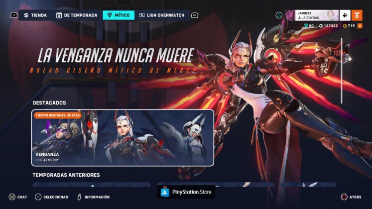 Por el momento se encuentran disponibles 8/9 aspectos, ya que la regla a tener en cuenta es que se le da exclusividad de 1 o 2 temporada a la ultima skin de cada pase; es decir si no desbloqueamos a Mercy Venganza ahora, recién volverá a estar disponible en la temporada 12/13 (salteándose la temporada 11/12), si surge algún cambio lo estaremos avisando. Me gusto mucho que se le de a los jugadores esta posibilidad, ya que no todos son completistas y quieren absolutamente todas las skins de los pases. Este sistema de juego te invita a que si una skin de temporada no es de tu agrado, poder jugar igual para obtener los Prismas Míticos y esperar a comprar una skin que te guste, o la posibilidad de adquirir skins anteriores.