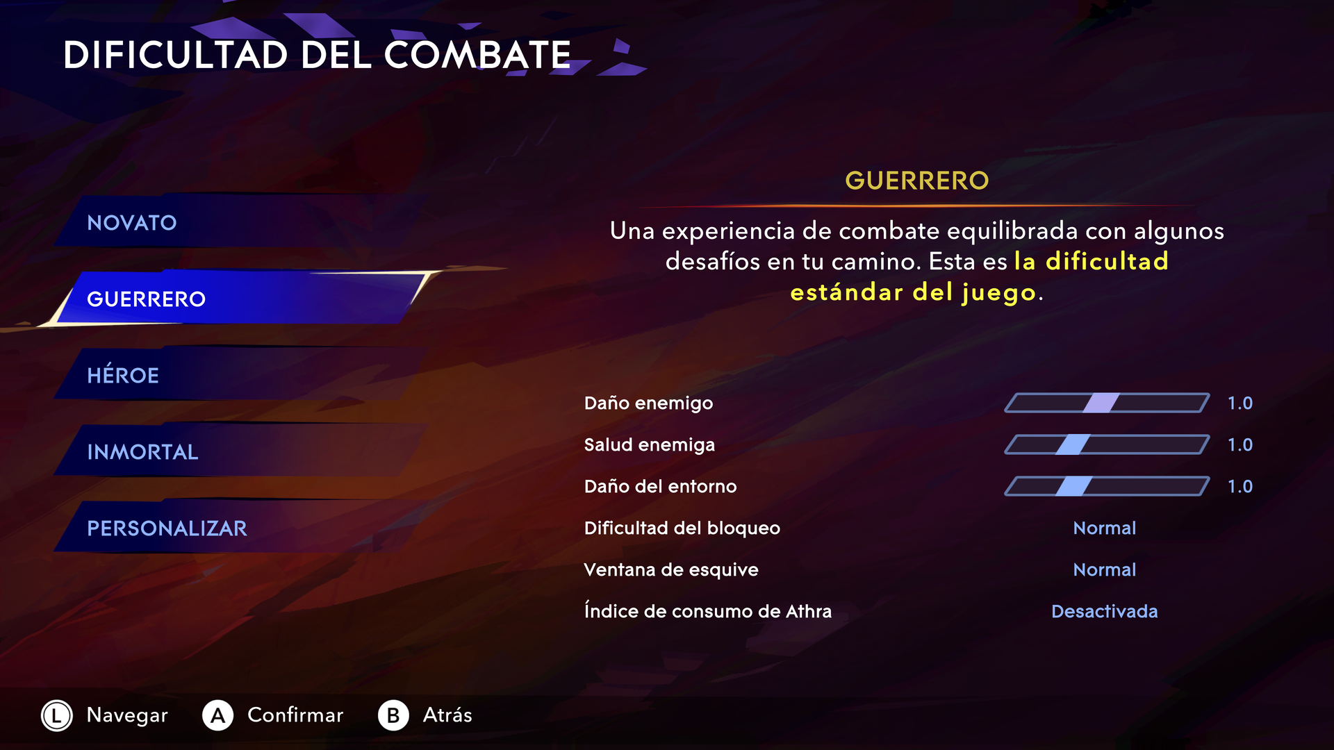 Ya que mencioné la dificultad, tengo que aplaudir las opciones de personalización de partida que nos brinda el título apenas iniciamos una nueva aventura. Podremos seleccionar ciertas dificultades estándar (fácil, medio, difícil, imposible… básicamente) o también alternar cualquiera de los puntos a medida. Por ejemplo, definir si los enemigos hacen el doble de daño o la mitad, independientemente de si nuestro personaje atacará más fuerte, o si seremos penalizados con más furia de Athra cuando no esquivemos los golpes, entre otras cosas. Esto fue lo primero que vi, y si bien seleccioné la dificultad “Guerrero” (la que tiene por defecto) me sorprendió gratamente la preocupación de Ubisoft en que la experiencia sea completamente personalizada.