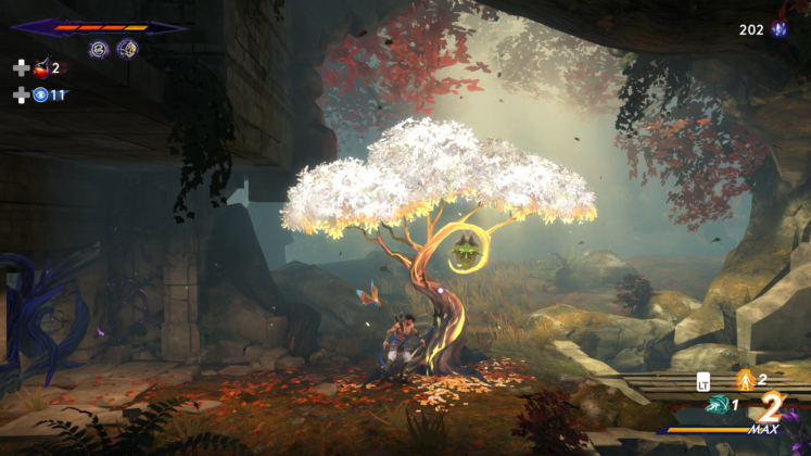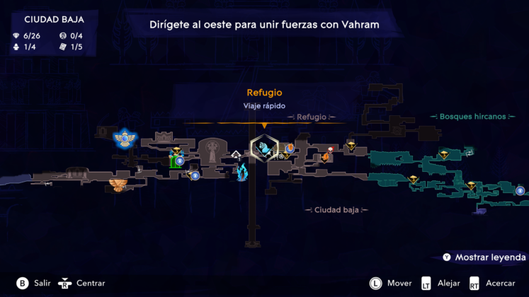 El mapa es muy extenso. Por suerte, se suman a partir de cierto momento estaciones de teletransporte. Estas nos permitirán visitar con frecuencia el Refugio, donde tendremos la posibilidad de entrenar, pedir consejos y comprar talismanes o mejoras. Los talismanes nos darán ventajas y deben ir en nuestro collar de la misma forma que en el Hollow Knight, donde cada uno de ellos tiene un “costo” y no podremos pasarnos del total a menos que encontremos mejoras del collar. También influenciado por el título Team Cherry, encontraremos a medida que circulemos por el mapa a una amiga que nos venderá zonas de mapa que cartografió. Este tipo de herramientas facilitan el backtracking, gracias a puntos de viaje rápido y la presencia constante de árboles Wakwak, que son los elementos de guardado de la partida, junto con la recuperación de consumibles. Cada región del mapa cuenta con su propio diseño distintivo y fondos visibles a la distancia, los que parecen pintados a mano.