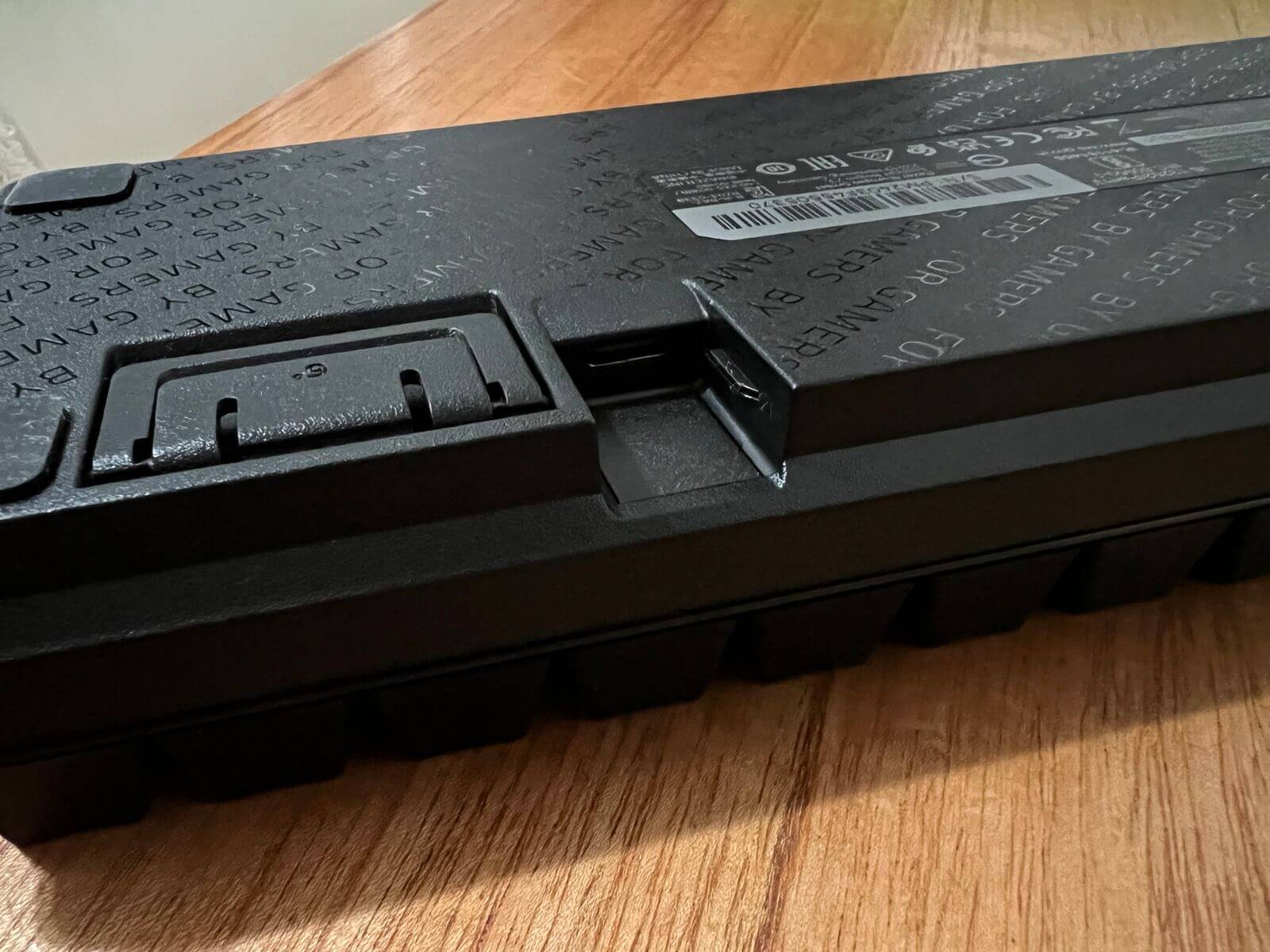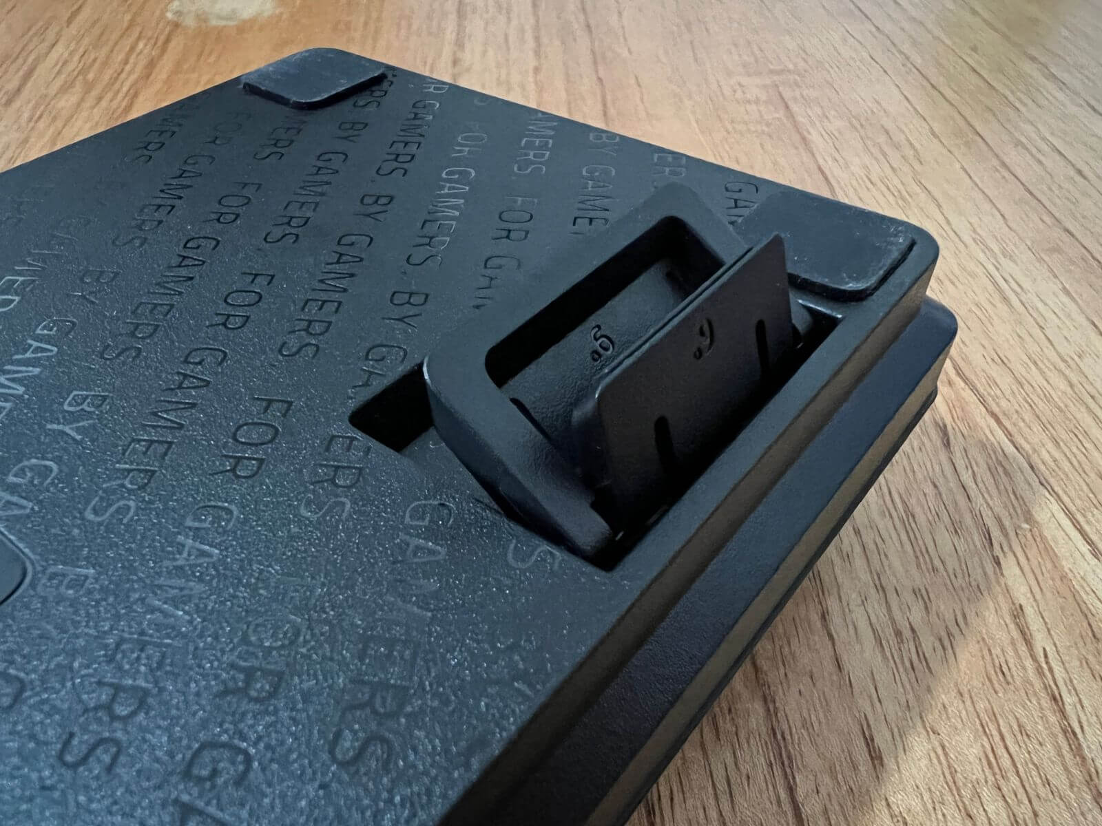 La base cuenta con cuatro soportes de goma antideslizante y dos soportes de elevación ajustables con diferentes posiciones (6 y 9 grados). Esto permite adaptar la inclinación del teclado para una mayor comodidad durante el uso prolongado. Además, el cable USB-C es extraíble, lo que facilita su transporte y almacenamiento sin el riesgo de dañar el conector. Algo simpático es que el conector USB-C que posee en el teclado tiene una especie de guías laterales para que nunca fallemos al momento de enchufarlo.