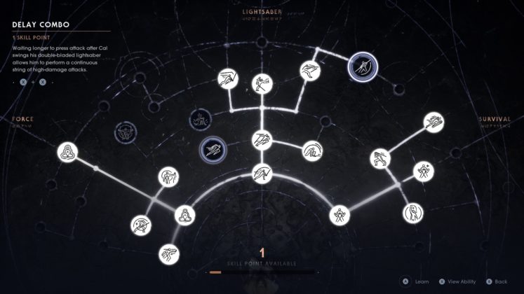 Así mismo, hay habilidades relacionados con Cal y BD-1 (nuestro droide amigo y compañero de aventuras), que no son desbloqueadas con experiencia, sino con la progresión del título y están relacionadas con la necesidad de Cal de avanzar.