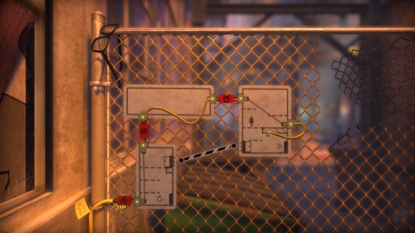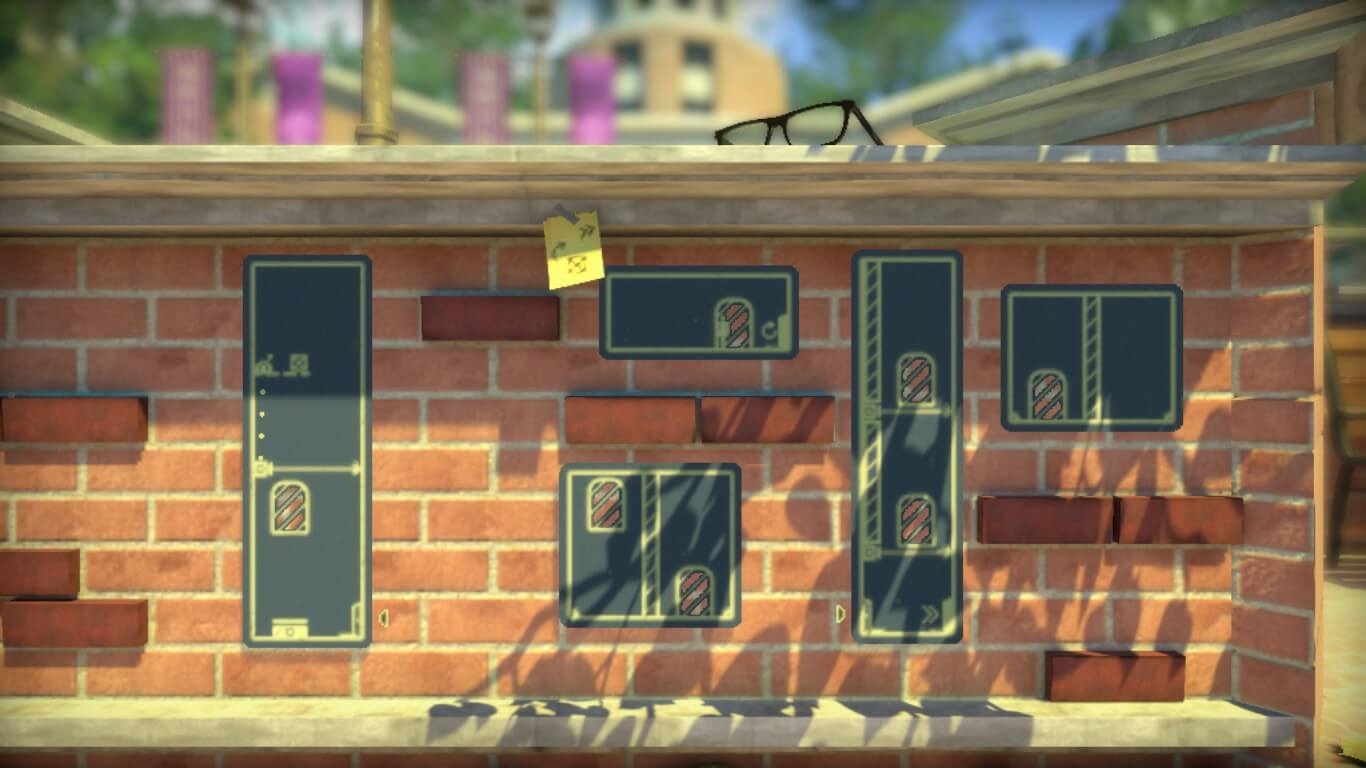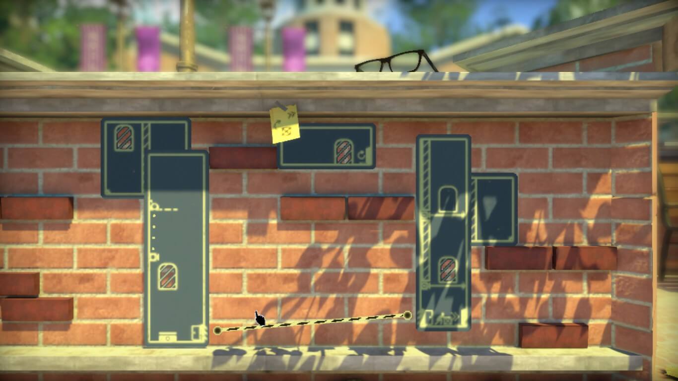 En cuanto al apartado gráfico, es interesante cómo está trabajado. El título no se define estrictamente por una ambientación en 2D ni en 3D, sino que mantiene el juego entre ambas. A medida que avancemos, la cámara se moverá con nosotros, permitiéndonos adentrarnos en la profundidad de los escenarios, sean galpones, edificios y ascensores. Hasta también acompañaremos a nuestro querido monigote en un viaje en subte, desde la cabina de control, para llegar a la próxima locación. Para resolver los puzzles en ocasiones deberemos relacionar distintos carteles entre sí. En estos casos, utilizando la vista tridimensional, dando un paso para atrás para ver el panorama completo y así poder establecer las relaciones que creamos correctas, entre las señales. Posteriormente nos volveremos a acercar, y lógicamente al ser una silueta, nos desplazaremos entre los carteles, desde su propio 2.5D, y así seguir nuestro camino.