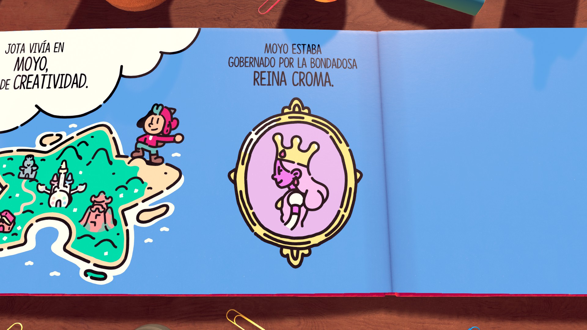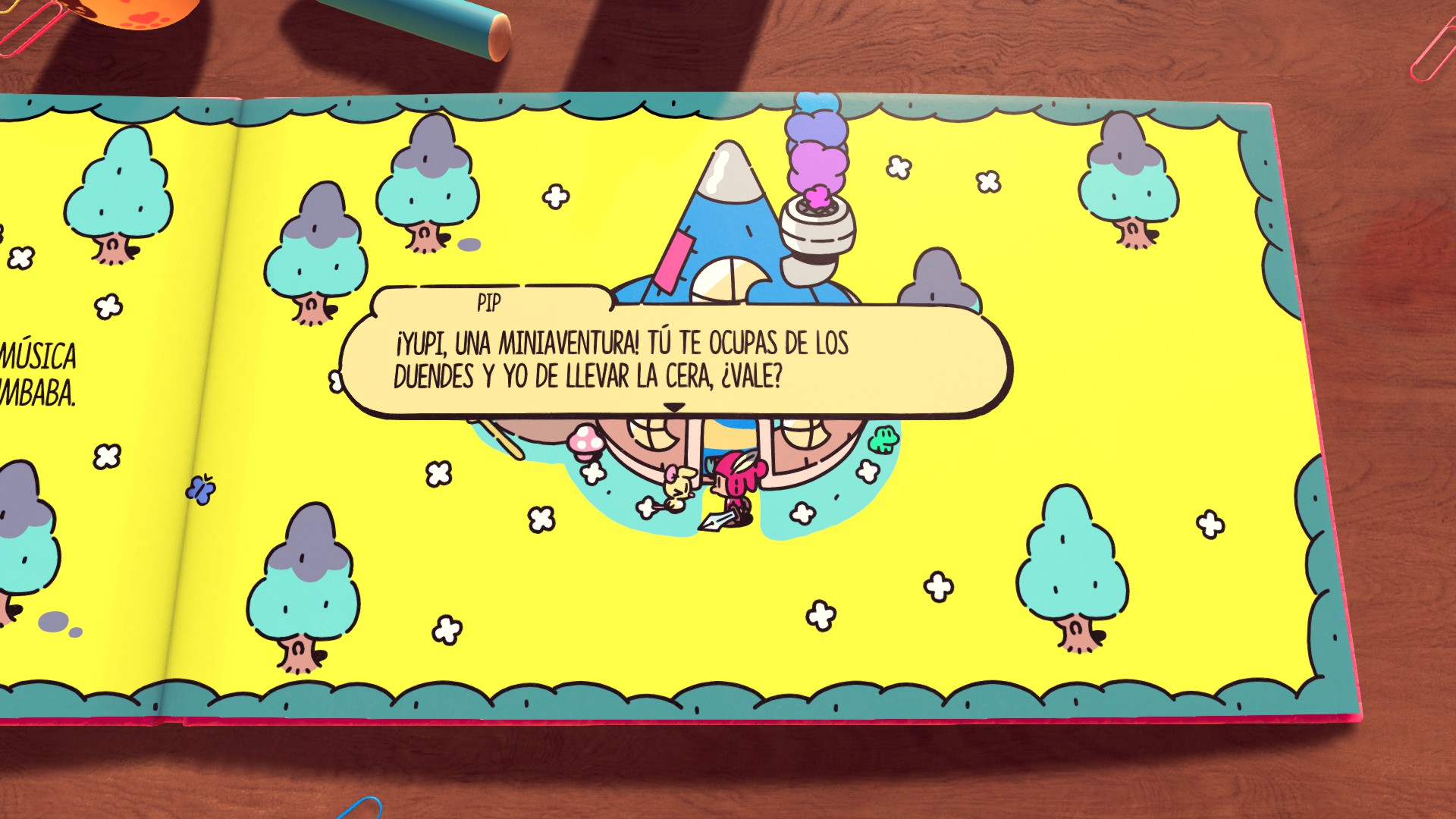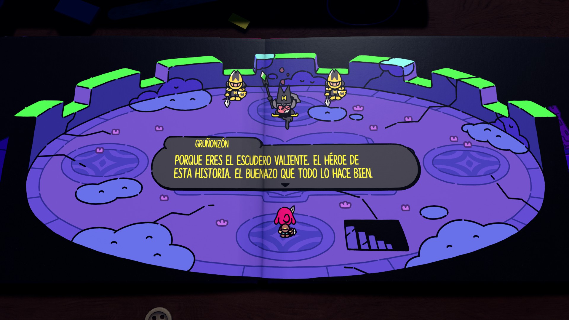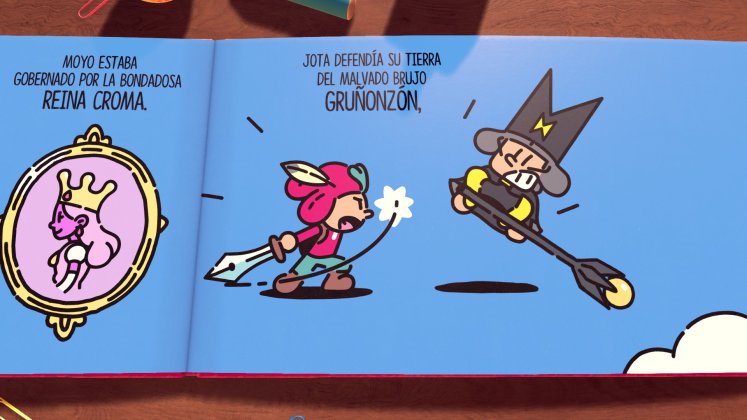 Para darnos un poco de contexto, la historia comienza en Moyo, un reino ficticio donde Jota, el llamado “Escudero Valiente”, se enfrenta al malvado hechicero Gruñonzón. Dentro de la narración a la que el videojuego nos sumerge, Jota no es solo un héroe, sino también el autor de sus propias aventuras, plasmadas en libros que han cautivado a generaciones de lectores. Entre esos seguidores está Sam, un niño que sueña con escribir su propia serie de novelas al crecer, inspirado por las hazañas de Jota.