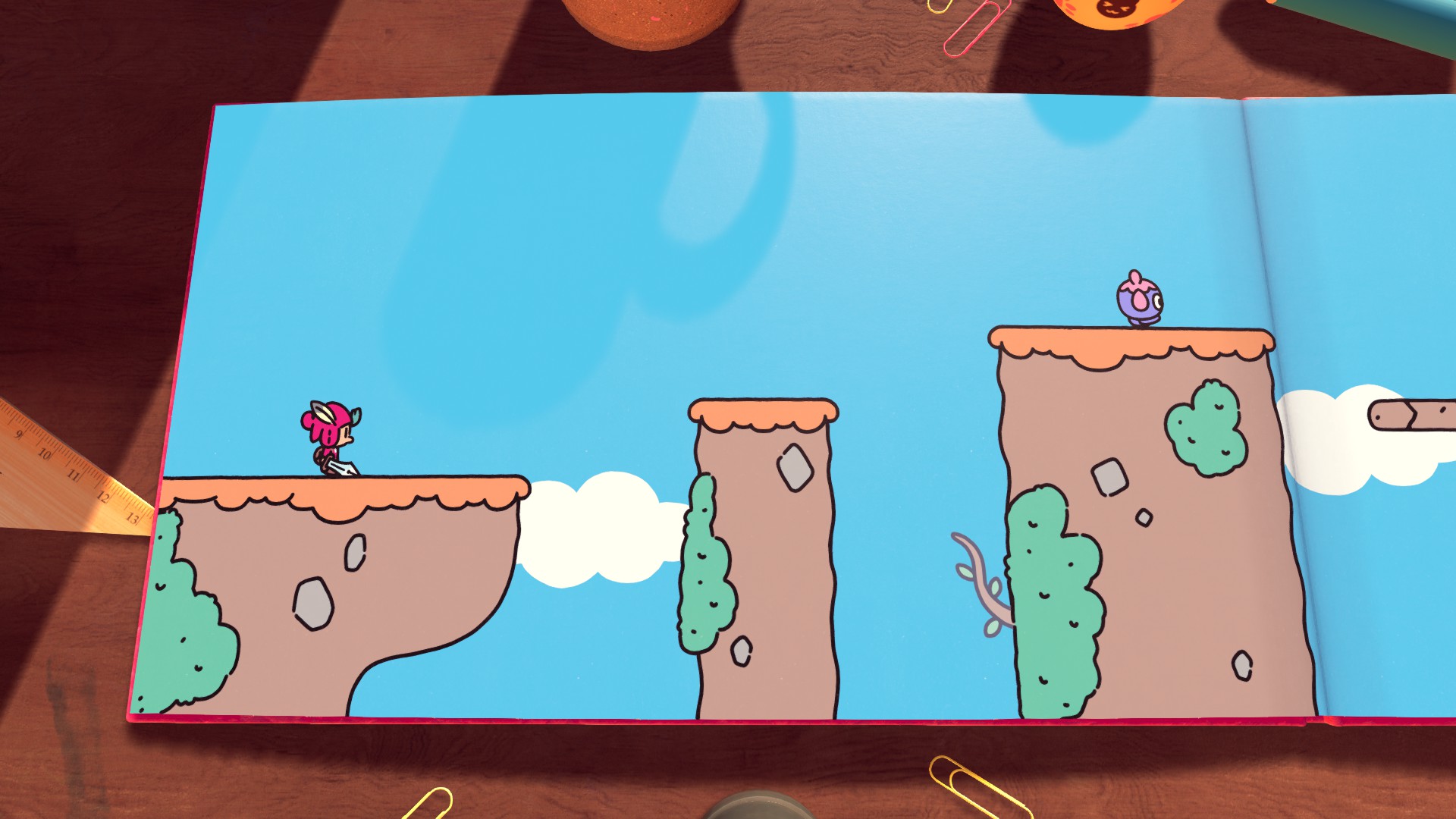 Muy poco después de iniciar la aventura, el juego comienza a mostrar su verdadera cara. Gruñonzón descubre que tanto él como los demás personajes son parte de una historia predestinada, lo que lo impulsa a alterar el curso de los eventos. Cuando Jota intenta detenerlo, es expulsado del libro gracias a la magia de su enemigo, revelando un mundo exterior mucho más grande. Este es el momento donde, luego de una pequeña aventura en el escritorio de Sam, adquirimos los Guanteletes Pasapáginas, un objeto que permite navegar entre el libro y la realidad, así como pasar las hojas del libro.